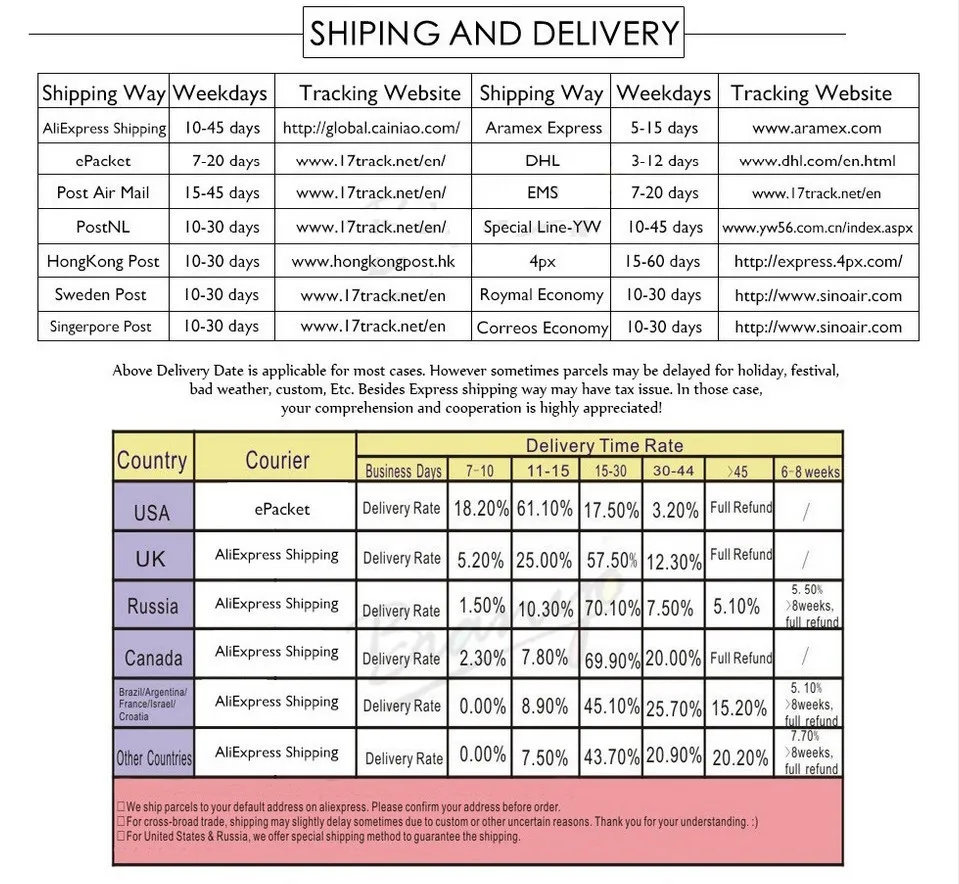 1. Когда мы получили информацию о вашем заказе и оплате, мы обычно 2-5 дней для завершения доставки, мы предоставляем информацию отслеживания логистики. Однако из-за определенных факторов и региональных проблем, которые могут привести к задержке доставки, надеюсь на понимание, время доставки обычно составляет 15-40 дней, пожалуйста, будьте терпеливы.