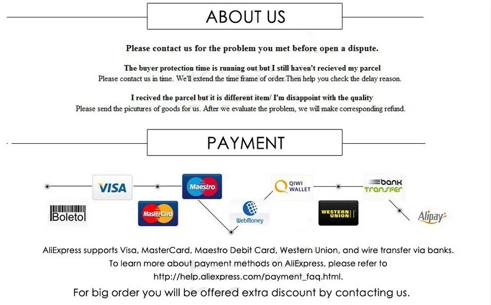 1. На Aliexpress доступны различные способы оплаты, такие как Alipay, кредитные карты, банковские переводы в реальном времени, офлайн-платежи (банковские переводы и Western Union). Вы можете выбрать наиболее удобный для Вас способ. Для защиты ваших интересов оплата будет временно задержана компанией Alibaba и не будет передана нам, пока вы не получите заказ и не подтвердите, что остались им довольны.
