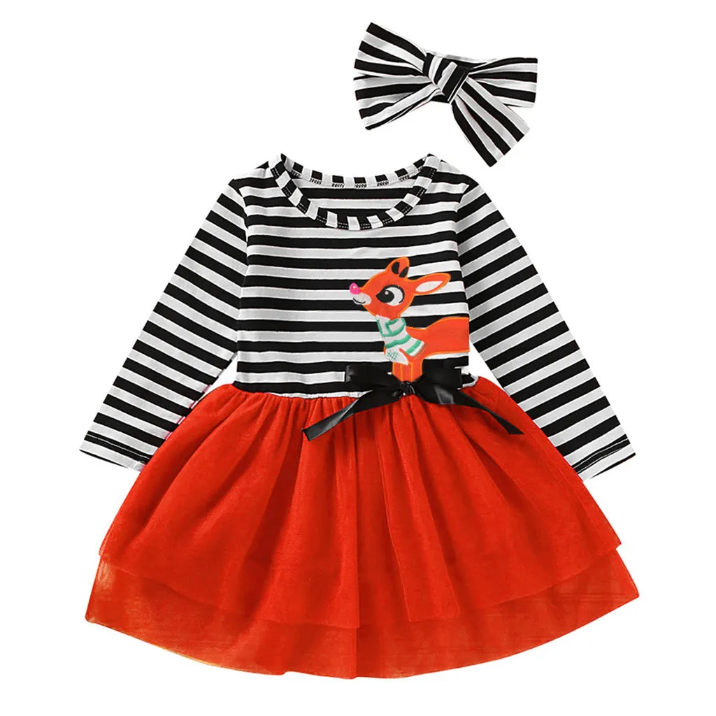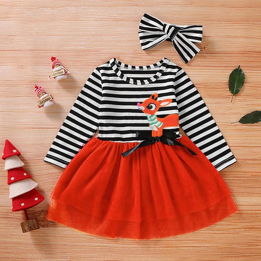 Платье из тюля в полоску с рождественским оленем для маленьких девочек + повязка на голову