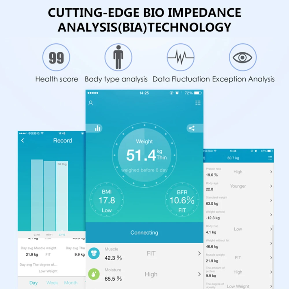 Показывает 18 видов данных о вашем теле, включая вес, ИМТ, воду, Висцеральный жир, мышцы, костную массу, белок и т. д.