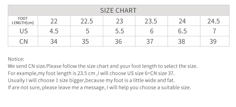 Мы отправляем китайские (китайские) размеры. Пожалуйста, следуйте таблице размеров и длине вашей стопы, чтобы выбрать размер. Например, длина моей стопы составляет 23,5 см, я выберу американский размер 6 = Китайский размер 37. Обычно я выбираю на 1 размер больше, потому что моя стопа немного широкая и толстая. Если вы не уверены, пожалуйста, оставьте мне сообщение, я помогу вам выбрать подходящий размер.