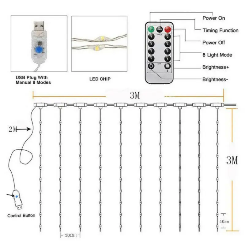 Material:Plastic,Copper Size:about 3*3M*300 LED Waterproof:Yes Voltage:5V USB Power:3W Light source:LED Number of LEDs:300 LEDs LED color:Multicolor/Blue/white Life:50,000 hours 1. Easy to install on most surfaces: Glass, wood, metal, and plastic High-quality and long lifespan for indoor and outdoor use. 2. Low power consumption with bright colors. 3. Energy-efficient, virtually no maintenance. 4. Plug and play, simple to operate. 5. Great for Christmas window display, party, birthday, wedding, festive lighting, etc. 6. The controller of the string is Not Waterproof, so when you use it Outdoors, you can wrap it with tape or a plastic bag, which can avoid rain and extend the life of the string, Thank you.