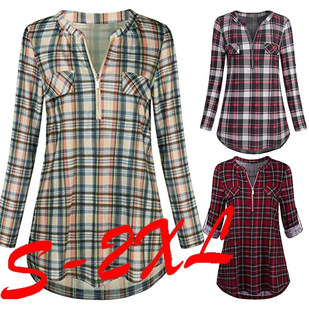 Женская Повседневная рубашка на молнии с v-образным вырезом, рубашка в клетку с принтом, туника, топы, блузка