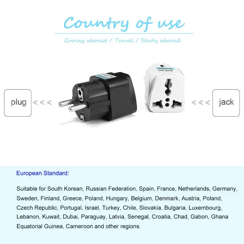 Особенности товара: 100% Новый адаптер для путешествий Легкий и простой в использовании Тип штепсельной вилки: штепсельная вилка ЕС/КР 2pin Размер штепсельной вилки европейского стандарта (Д x Ш): 19x4,8 мм Материал: Огнестойкий АБС, металл Напряжение/ток: 250В 10А Цвет: белый/черный