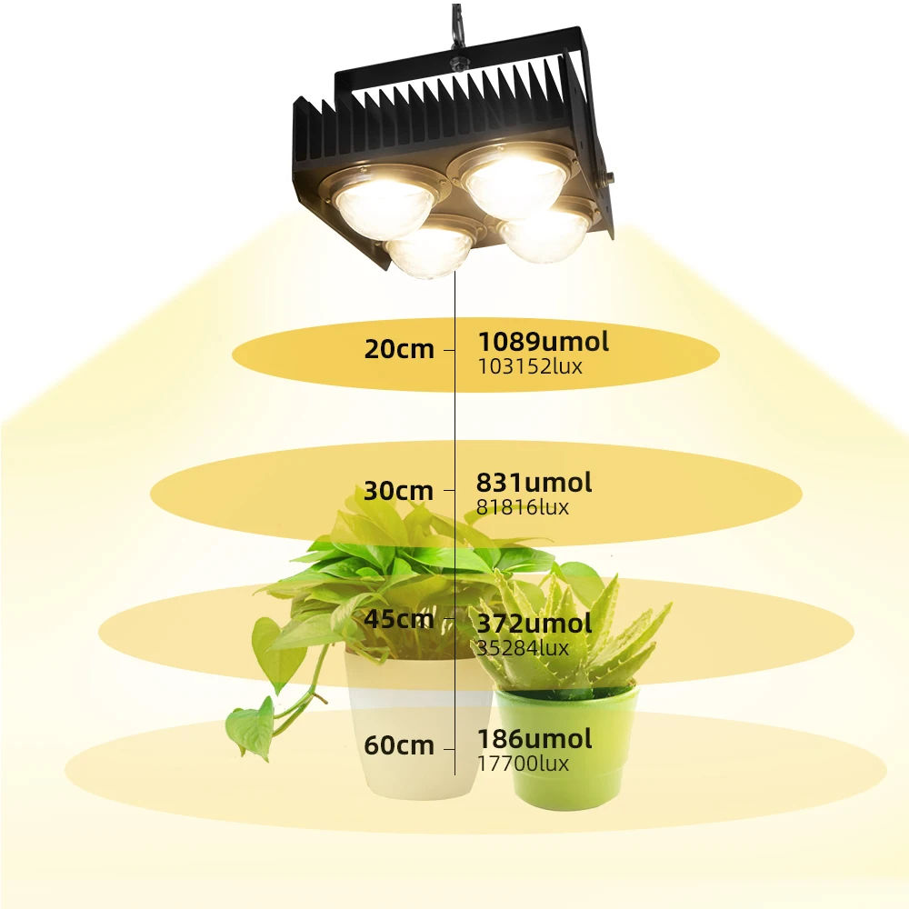 Длина 90 ° 】Стеклянный объектив 90 градусов делает светильник более сфокусированным с более высокой эффективностью. 4 шт. светодиодный индикатор может поставить высокий Номинальный выход 1089 мкмоль на высоте 20 см (8 дюймов).