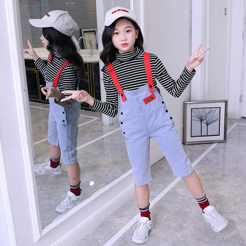 Комбинезоны для девочек-подростков; комбинезон; сезон лето-весна-осень; джинсовые комбинезоны в ковбойском стиле; детская одежда; комбинезон; джинсы с красной лентой