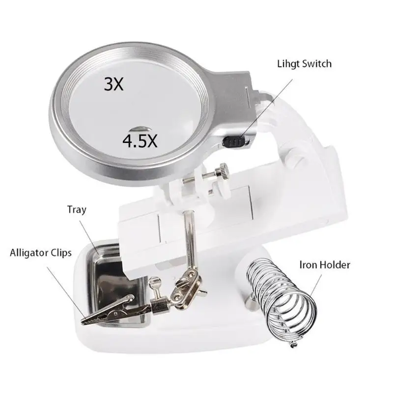 ![]() Особенности: Регулируемые зажимы и держатели для аллигатора, удерживающие предметы под любым углом. С базой для хорошей стабильности. В комплект входит держатель для электрического паяльника. Два объектива с различными увеличениями: 3X/4.5X. С белым светодиодный ным светом, очень хорошо работает в темной среде. Отличный продукт, когда нужна третья рука. Полезный инструмент для пайки/ремонтных работ, сборки изделий или изготовления моделей. Характеристики: Цвет: белый Материал: ABS + металл + акриловые линзы Увеличение: 3X (основной объектив) / 4.5X (Вспомогательный объектив) Диаметр объектива: прибл. 75 мм/20 мм Освещение: 10 шт. светодиодный Батарея: 3 * AAA 1,5 V батареи (не входит в комплект) или USB DC5V Размер изделия: прибл. 200*95*170 мм/7,87*3,74*6,7 дюймов Вес изделия: 374 г Размер посылка: 20,8*10*19 см/8,2*3,94*7,48 дюймов Вес посылка: 504 г