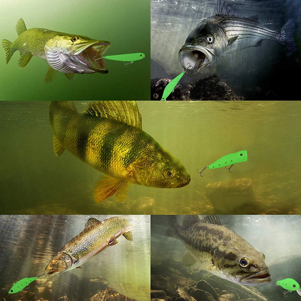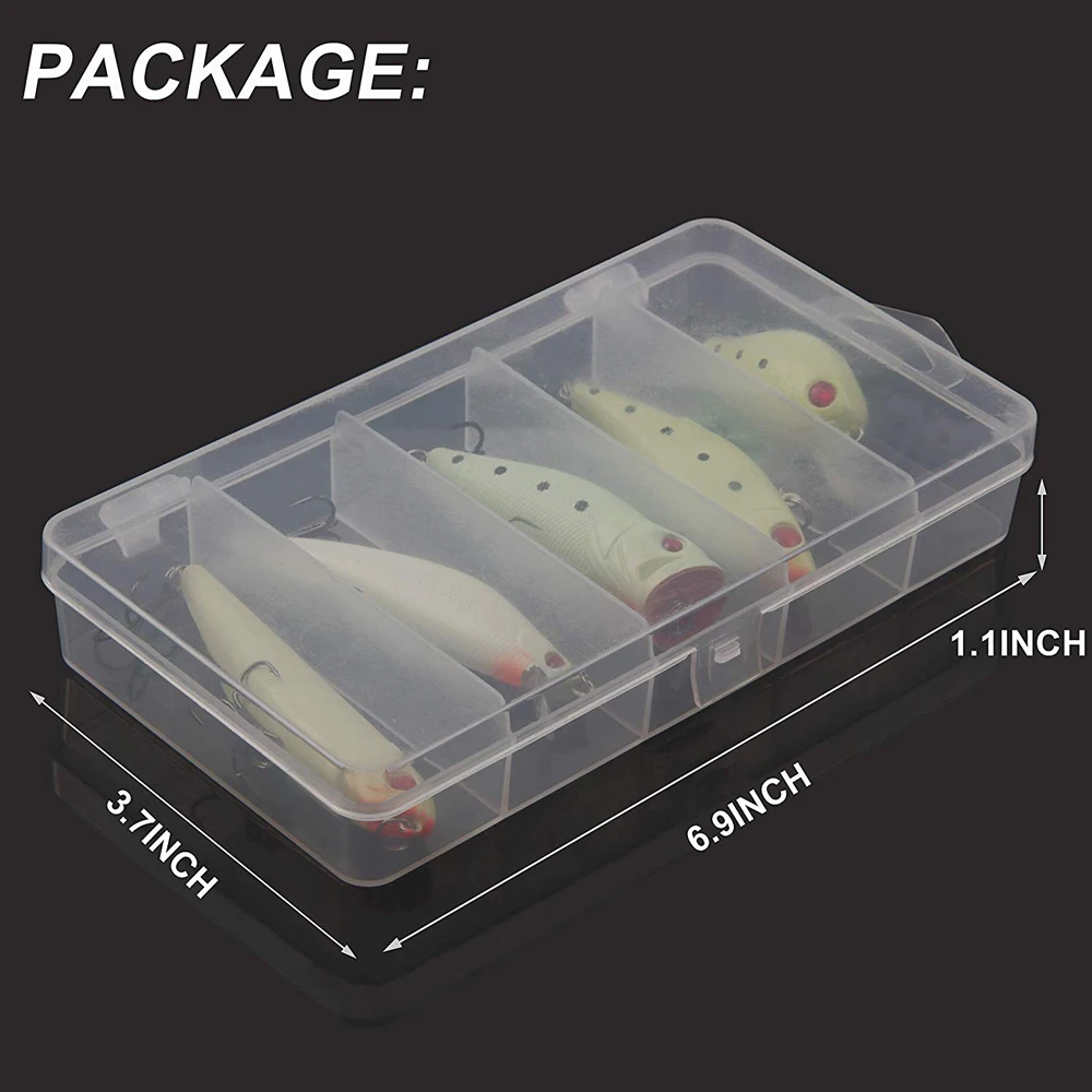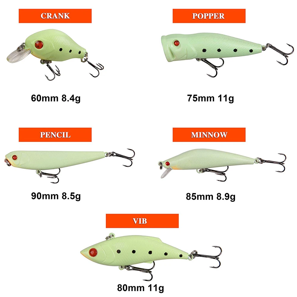 Описание продукта: 5 шт. набор для ночной рыбалки приманки с коробкой для снастей: 1. 1 штука 60 мм 8,4 г кривошипная приманка 2. 1 шт 85 мм 8,9g Minnow 3. 1 штука 80 мм 11g VIB 4. 1 шт 75 мм 11 г Поппер 5. Цельнокроеное платье 90 мм 8,5 г карандаш Светящиеся ночные 3D стереоскопические глаза, более реалистичные и яркие Уникальное движение как пожизненное плавательное действие в воде Светящиеся в темноте могут увеличить ваши уловы и создать больше удовольствия Это также станет отличным подарком для ваших друзей