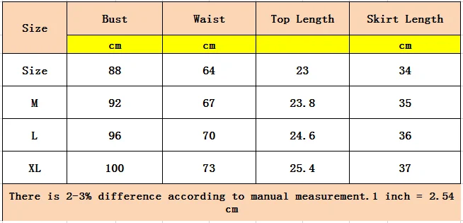 There is 2-3% difference according to manual measurement.please check the measurement chart carefully before you buy the item. 1 inch = 2.54 cm Please note that slight color difference should be acceptable due to the light and screen. What You Get: 1 x Two Piece Crop Top and Skirt