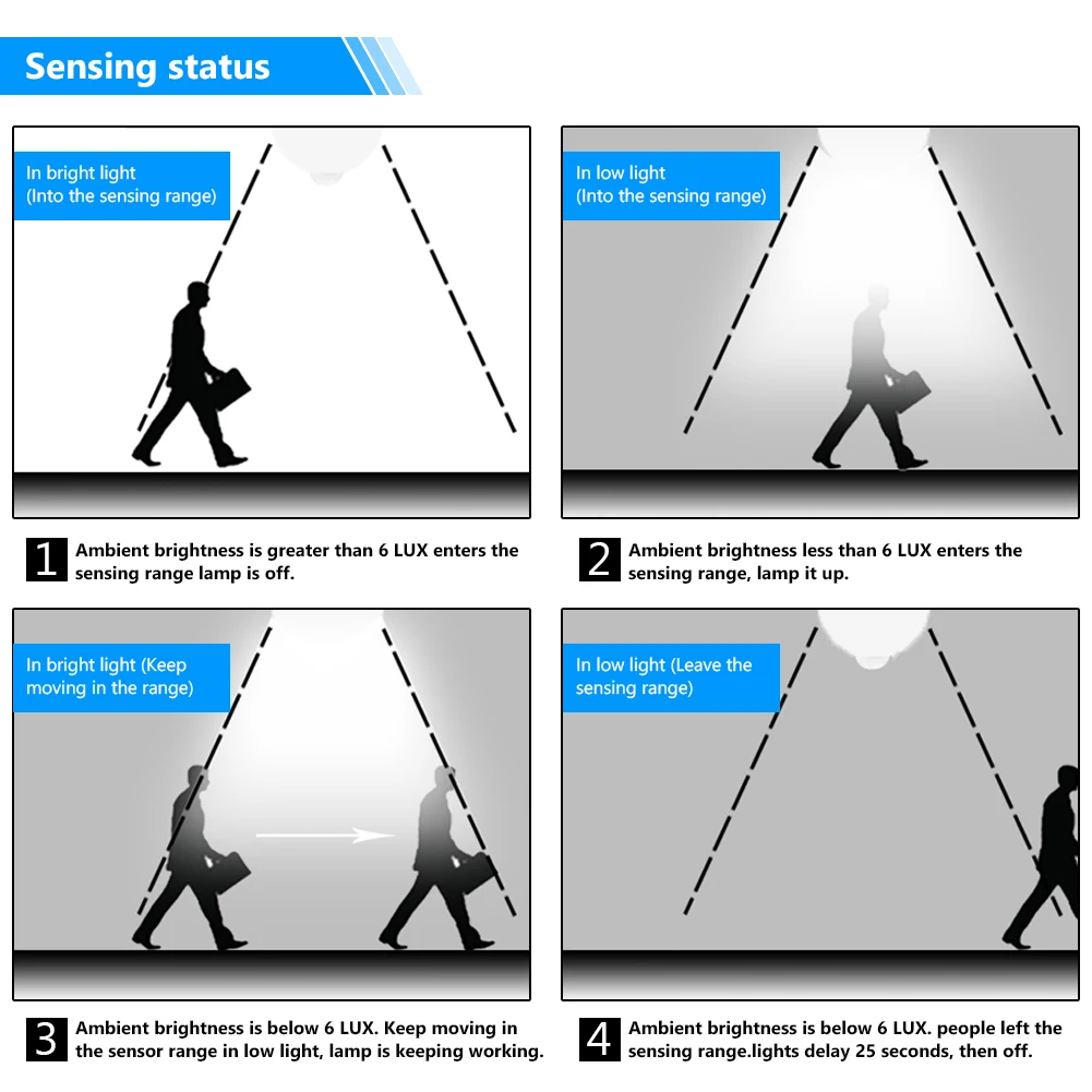 Высокая чувствительность, кто-либо или любое животное достигает чувствительной области ночью или в темноте, лампа загорится, задержка 25 с, если нет движения, то автоматическое выключение.