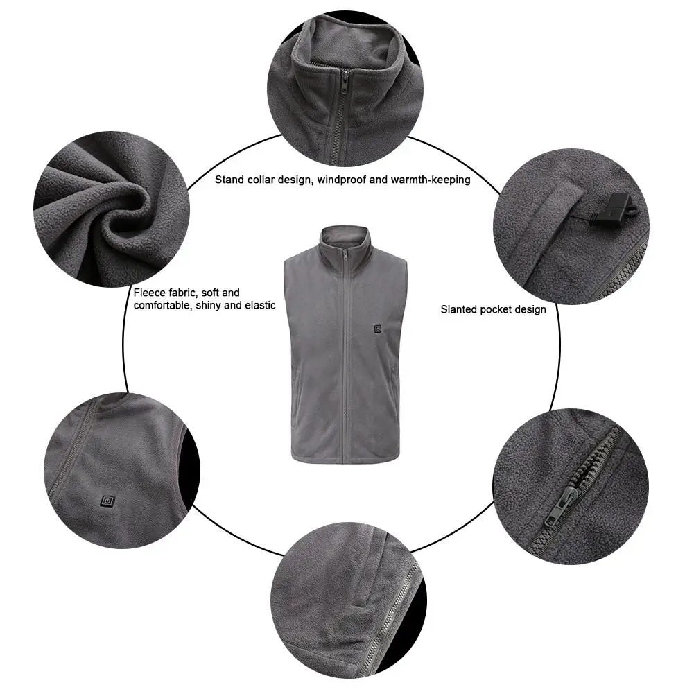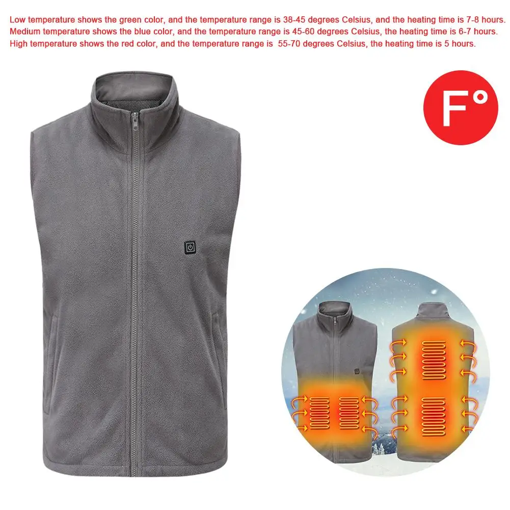 1. Продвижение фитнеса: жилет с питанием от 5 В может быть более безопасным в использовании и предложить достаточное количество тепла. Жилет может способствовать циркуляции крови, облегчению боли в мышцах. Это лучший подарок для родителей и семьи.2. Мягкий для ношения: жилет очень разработан, чтобы быть как сделанный на заказ верхняя одежда. Жилет отличается высокой износостойкостью и мягкостью при носке.3. Поставщик тепла: жилет оснащен 4 нагревательными элементами из углеродного волокна, которые генерируют и улавливают тепло по основным участкам тела. Жилет отличается высокой, средней и низкой температурой, что позволяет изменить уровень тепла нажатием кнопки.4. Широкое применение: жилет используется для активного отдыха, катания на лыжах, зимней рыбалки, альпинизма, мотоцикла, велосипеда, кемпинга, снежных прогулок, приключений, зимней улицы, посещаемости на открытом воздухе, офиса и т. д. Это идеальный подарок для ваших старших, любимых или друзей. Это лучший подарок на День Благодарения и Рождество.5. Прочная конструкция: стиральная машина не повлияет на систему отопления внутри нагревательной одежды, безопасна и долговечна. Жилет можно чистить руками, стиральной машиной, химчисткой.Особенности:1. Нагревательный материал из углеродного волокна, может быть согнут и не легко поврежден.2. Трехуровневая настройка температуры, 30 секунд может быстро нагреваться до 70 градусов Цельсия.3. 2 передних нагревательных элемента, один нагревательный элемент на спине и талии, большая площадь нагрева.4. Низкая температура показывает зеленый цвет, а диапазон температур 38-45 градусов Цельсия, и время нагрева 7-8 часов.5. Средняя температура показывает синий цвет, а диапазон температур 45-60 градусов Цельсия, время нагрева 6-7 часов.6. Высокая температура показывает красный цвет, а диапазон температур 55-70 градусов Цельсия, время нагрева составляет 5 часов.7. Воротник-стойка, ветрозащитный и теплый.8. Блок питания 5 В/2 а не входит в комплект.Технические характеристики:Название продукта: жилет с подогревом и зарядкой от USBМатериал: полиэфирное волокно (полиэстер) + флисРазмер: Пожалуйста, ознакомьтесь с таблицей для получения более подробной информацииОткройте инструкции по уходу за изделием1. Нажмите на смарт-переключатель в течение 3-5 секунд, чтобы начать, красный светильник, нагревающий одежду, начинает нагреваться и работать.2. Красный светильник около 70 градусов Цельсия, в скором времени нажмите переключатель в течение 1 секунды, и синий светильник около 60 градусов Цельсия.3. Нажмите переключатель, чтобы повернуть белый на зеленый светильник, стабильная температура составляет около 45 градусов Цельсия, нажмите в течение 3-5 секунд, чтобы закрыть.Инструкции по очистке:Жилетка может быть очищена стиральной машиной, пожалуйста, осторожно Стирайте при стирке.Упаковочный лист: 1 * USB зарядный жилет с подогревом