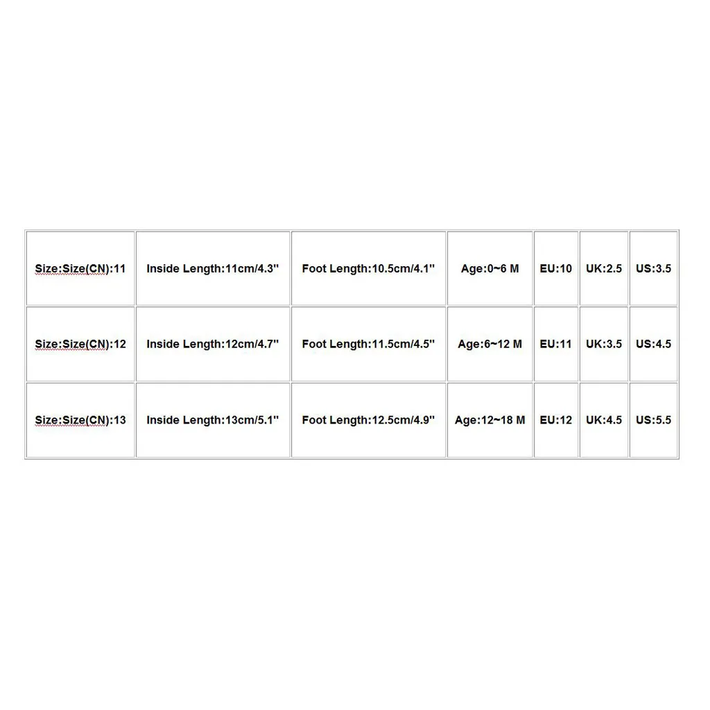 | Размер (CN): 13 | 13 см/5,1" | 12,5 см/4,9" | 12 до 18 месяцев | 12 | 4,5 | 5,5 |