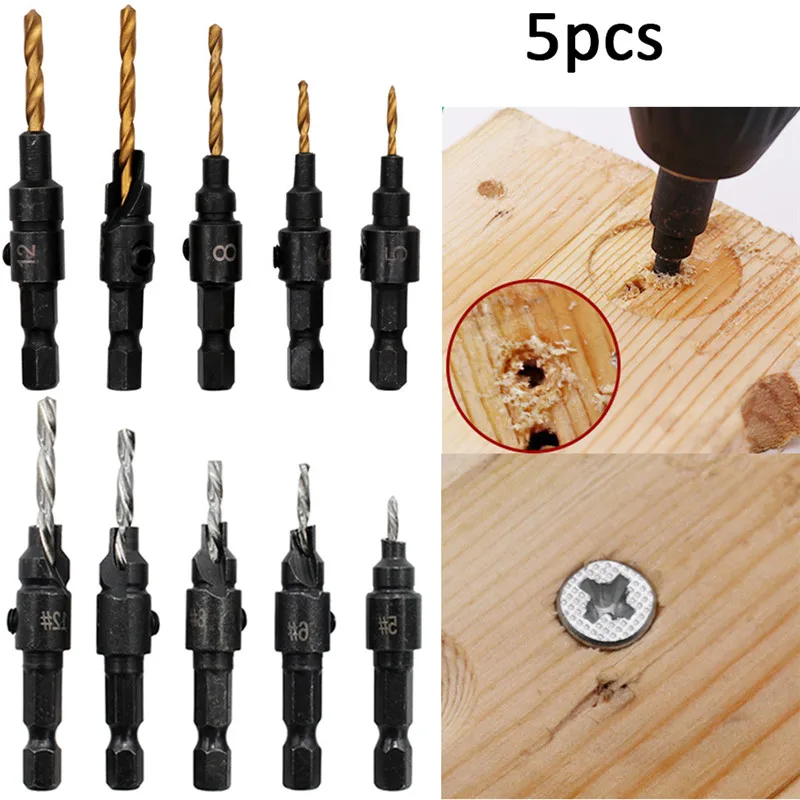 5Pcs Countersink Drill Woodworking Drill Bit Set Drilling Pilot Holes with 1 Hex Key Wrench Titanium Coated