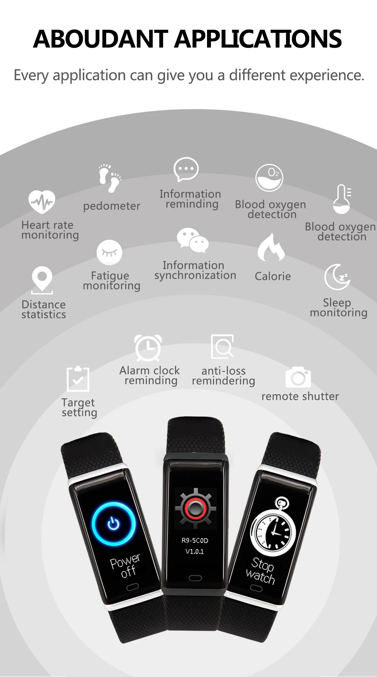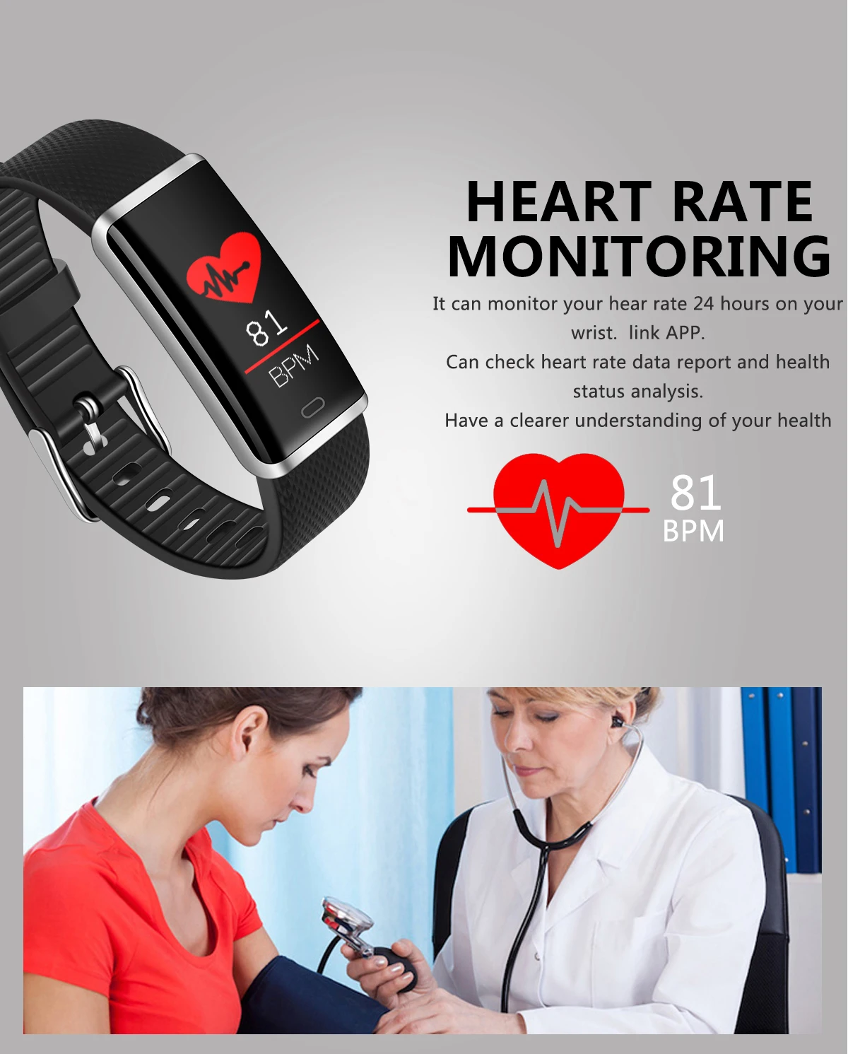 Предупреждение Пожалуйста, проконсультируйтесь с врачом, прежде чем начать новый спортивный товар, смарт-браслеты могут контролировать динамические частоты сердечных сокращений в реальном времени, но не могут быть использованы для каких-либо медицинских целей.