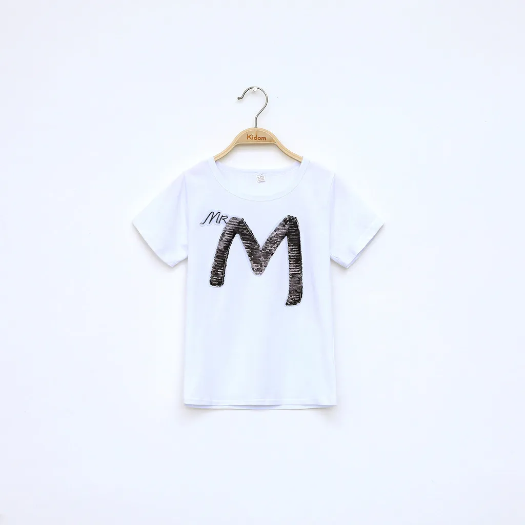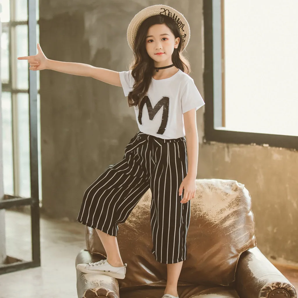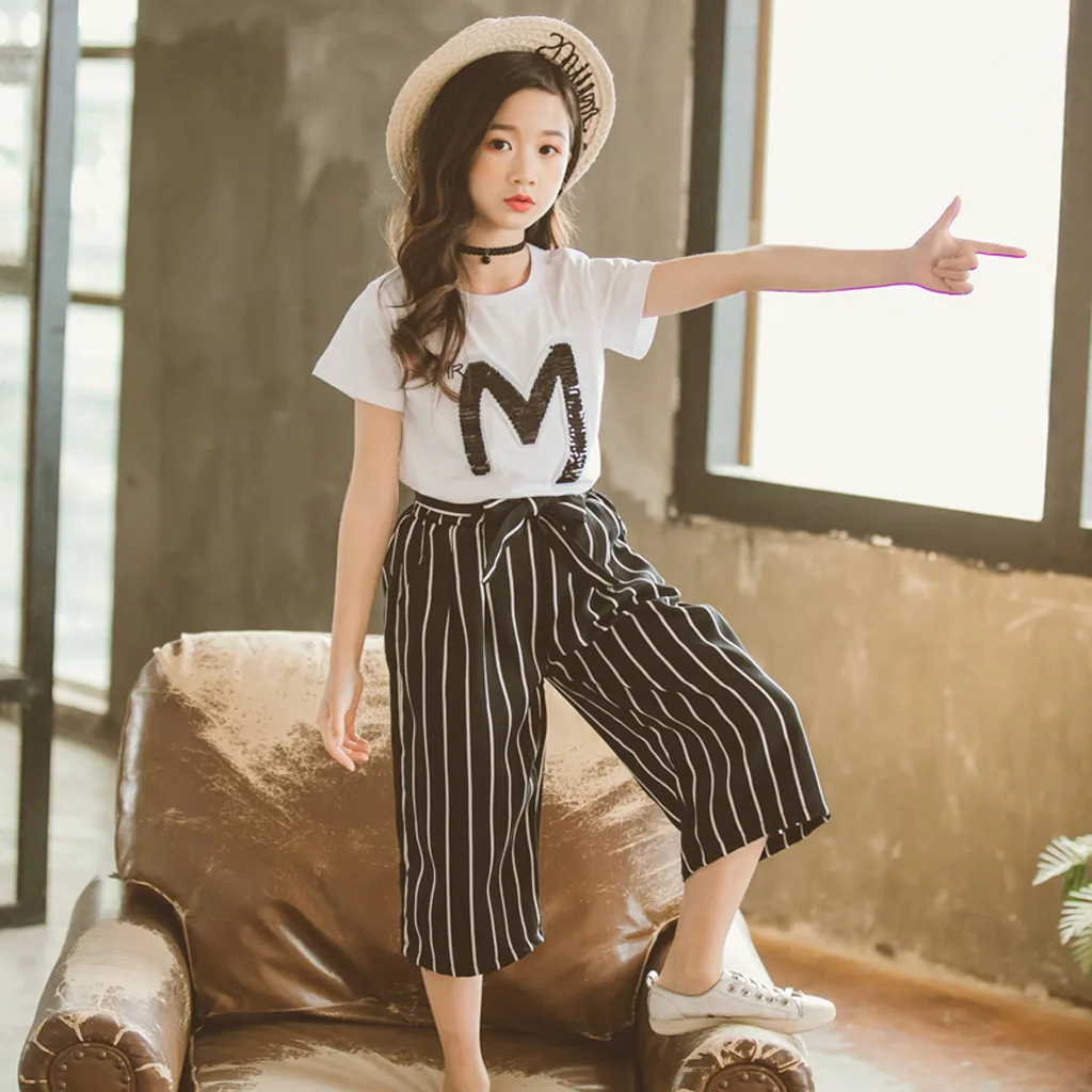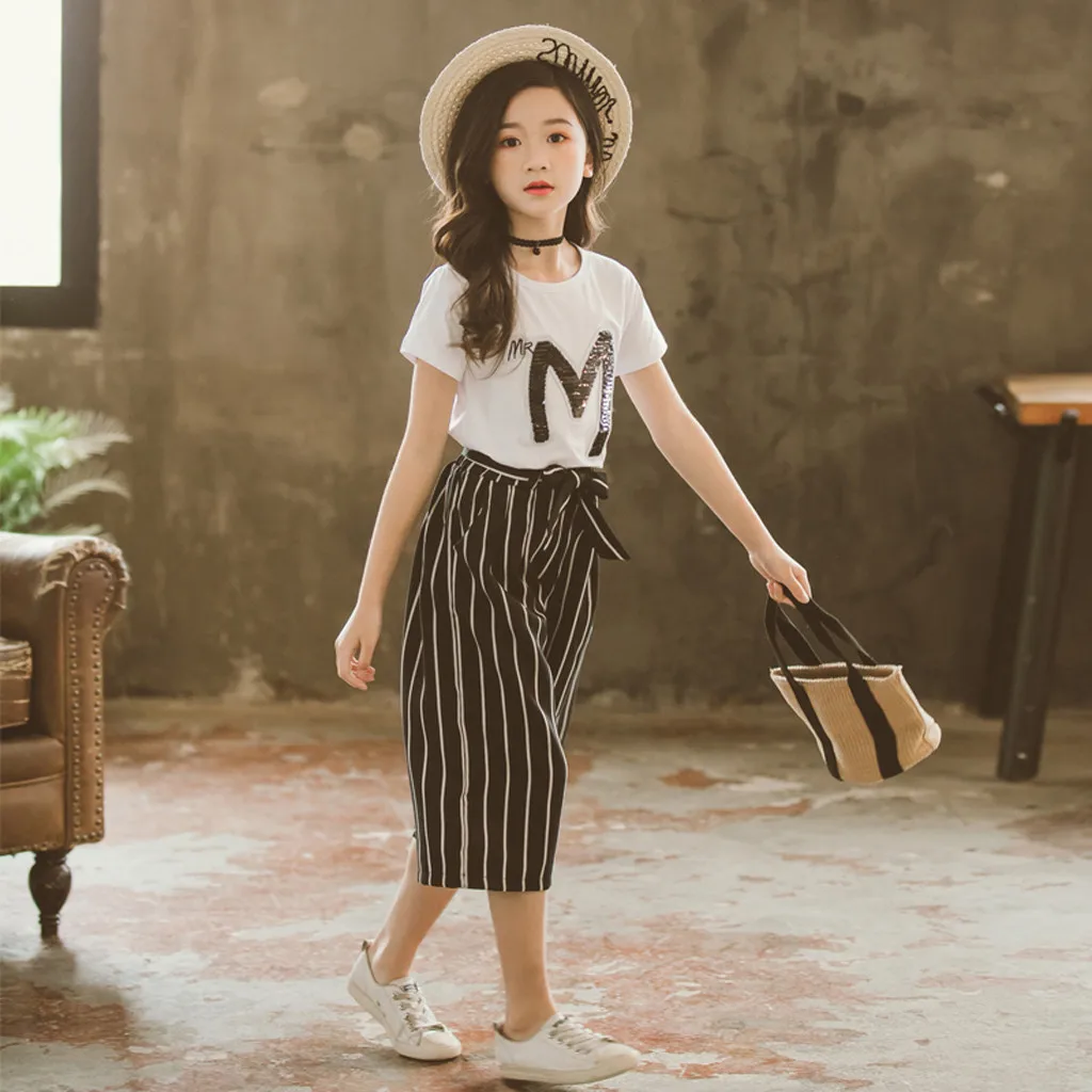 Футболка с блестками для девочек-подростков, топы с короткими рукавами, штаны в полоску, комплект одежды