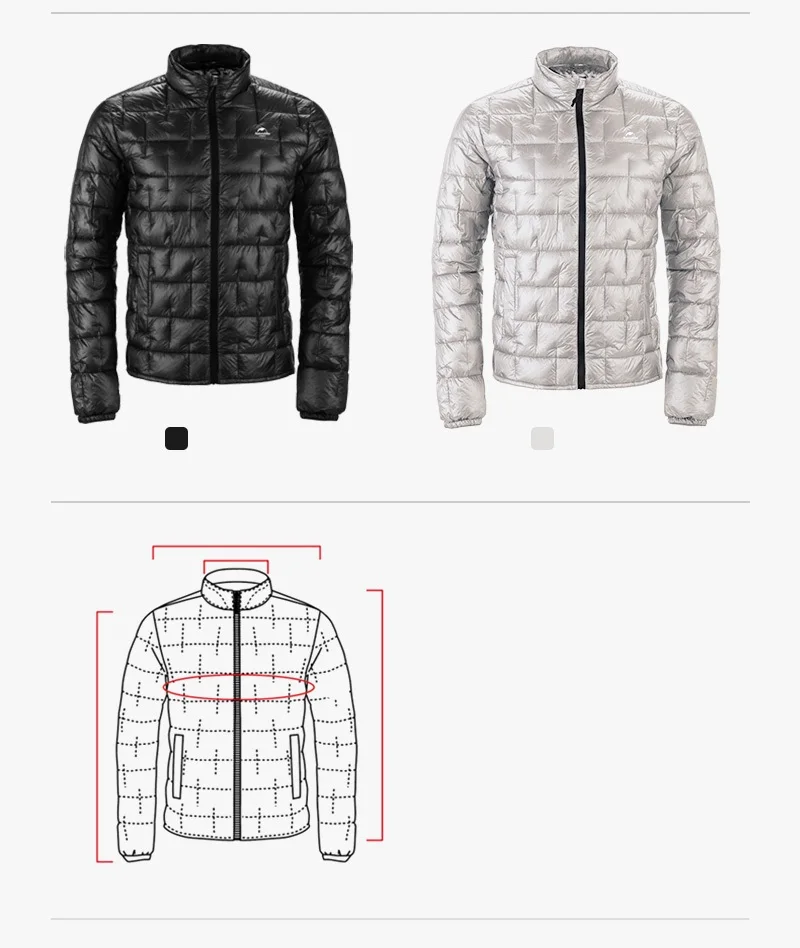Торговая марка: Naturehike Цвет: черный, серый Размер: M, L, XL, XXL Ткань: нейлон 10D 500T Наполнитель 1000FP белый гусиный пух Вес: около 200 г Особенности: ветрозащитная, непромокаемая, холодная изоляция Использование: Велоспорт, туризм, кемпинг, рыбалка и т. д.