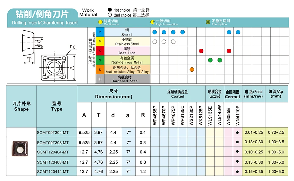 | SCMT09T304-MT WN4110P | Cermet | R0.4 | Steel | Cermet Insert,Sharp Good Wear Resistance |