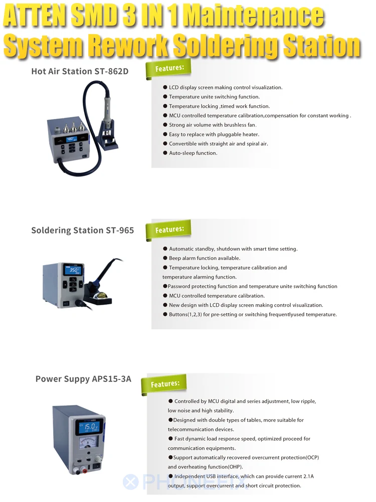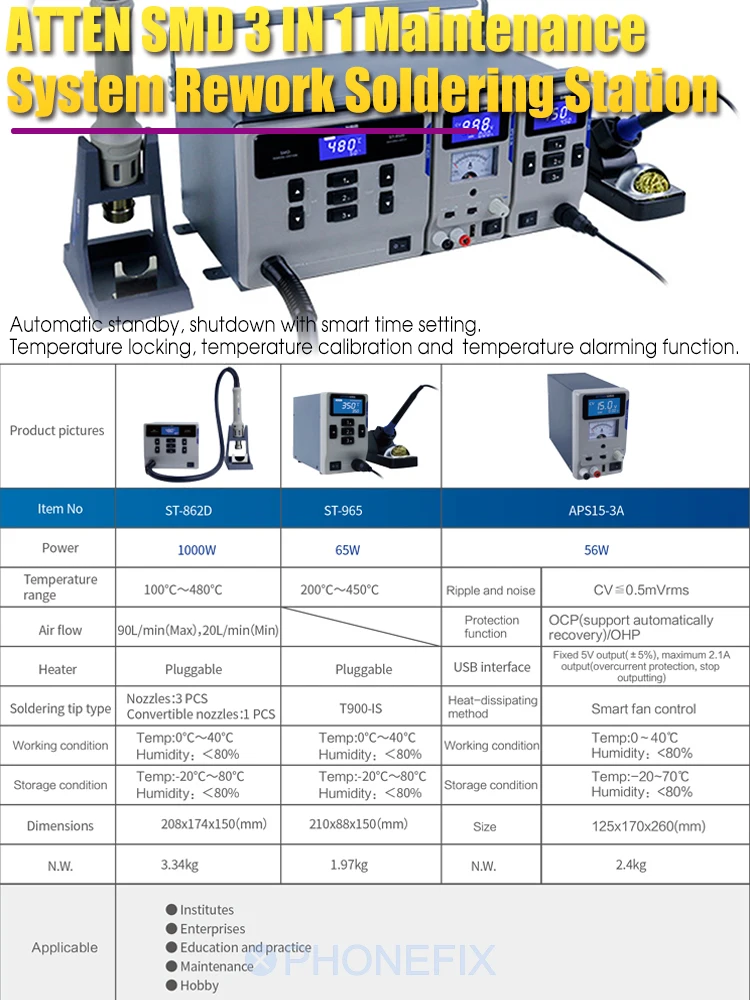 ATTEN MS-300 3 в 1 система обслуживания: источник питания постоянного тока 15 в 3 А + пистолет горячего воздуха 1000 Вт + паяльник 65 Вт (с 4 головка сопла)