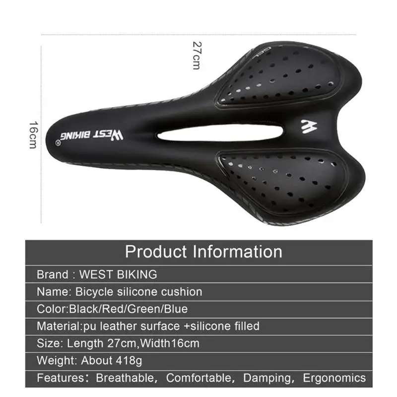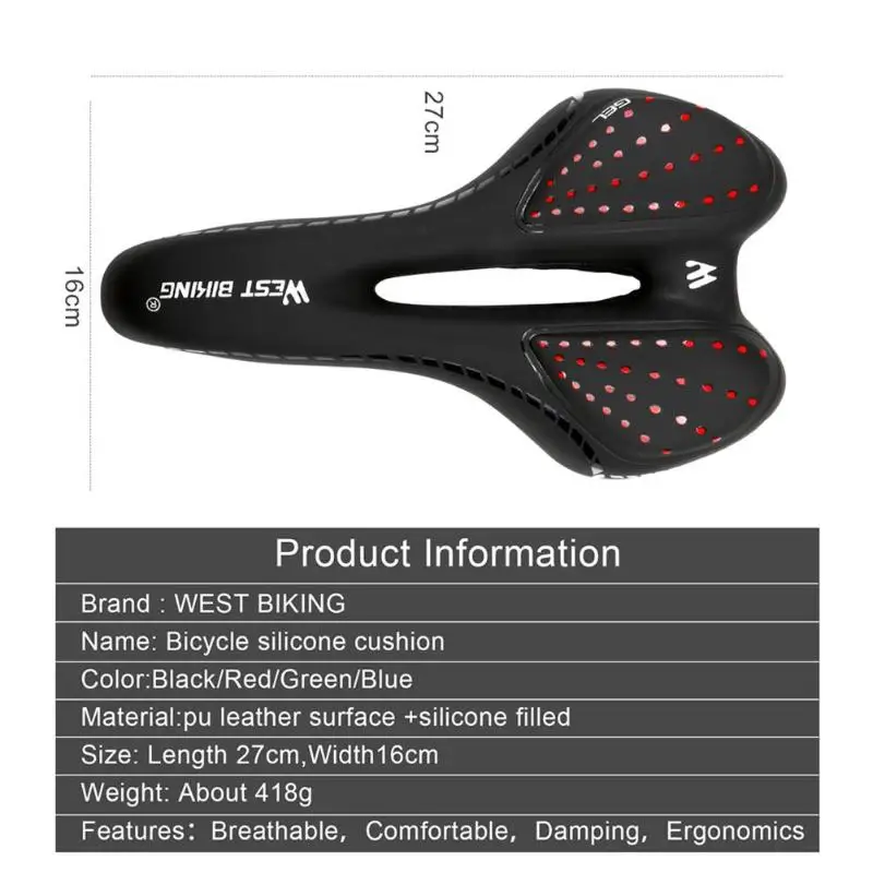 WEST BIKING велосипедное седло, Водонепроницаемая дышащая силиконовая подушка, искусственная поверхность, утолщенное MTB сиденье, Велосипедное оборудование Особенности: 1. Удобные, дышащие. 2. Водонепроницаемый. 3. Изогнутая подвеска, ударопрочный 4. Внутренняя часть подушки изготовлена из силикагеля высокой плотности и высокой эластичности. Обладает хорошей эластичностью, высокой плотностью, амортизацией и амортизацией. Характеристики: Материал: поверхность из искусственной кожи + силиконовая подкладка Цвет: черный/красный Размер: 270*160 мм/10,63*6,30" Вес: 418 г Подходит для: горного велосипеда Примечания: 1. Из-за различных настроек монитора и светильник эффект, фактический цвет элемента может быть s светильник ly отличается от цвета, представленного на снимках. Спасибо! 2. Возможны отклонения в 1-3 см вследствие измерений вручную. Велосипедное седло-1 шт.