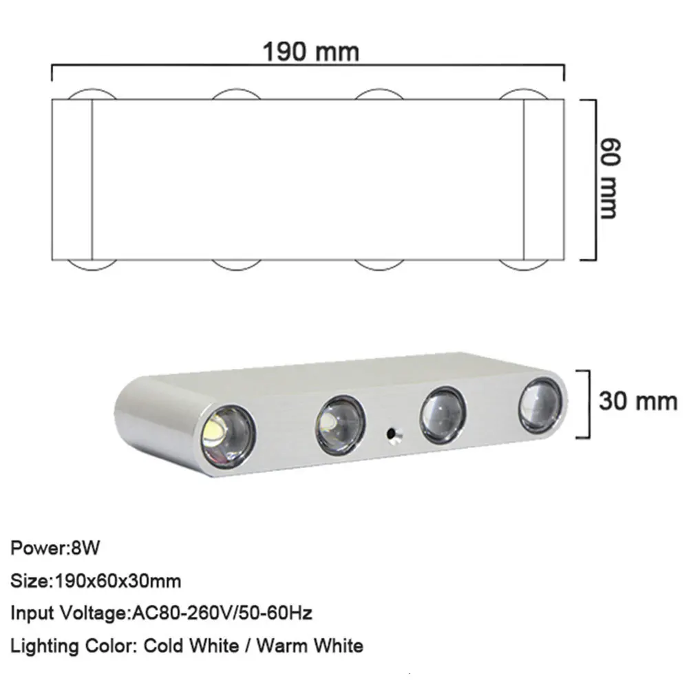 Параметры продукта: Название продукта: светодиодный настенный светильник Мощность: 2 Вт/4 Вт/6 Вт/8 Вт Светильник источник света: Epistar светодиодный чип высокой Мощность светодиодный Цвет излучения: холодный белый/теплый белый Цветовая температура: теплый белый, 3000-3500 K (бежевый) Холодный белый 6000-6500 K (белый) Световой поток: 90-100 лм/Вт Вход напряжение: AC100-265V 50/60Hz Материал корпуса: Алюминий Цвет корпуса: серебристый Угол луча: 60 градусов Срок службы:> 30000 часов Сертификация: CE и RoHS