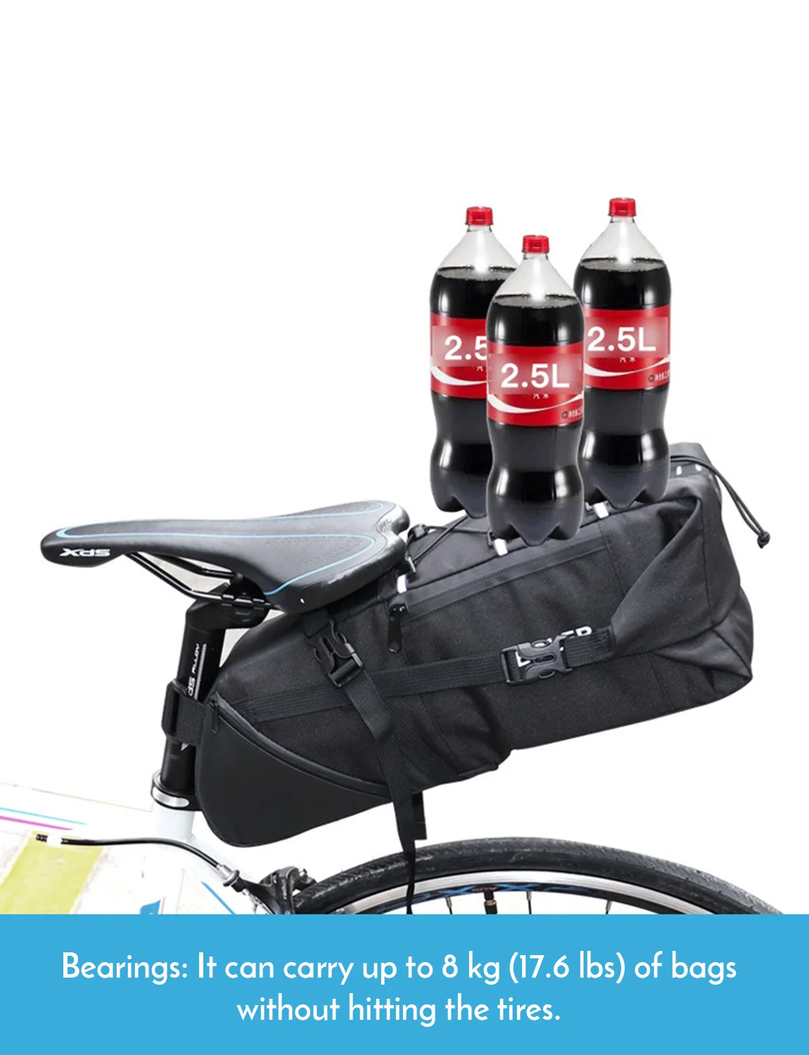 Портативный и легкий: Это вместительная сумка для сиденья, предназначенная для упаковки велосипедов, которая обеспечивает упрощенный способ переноски ваших предметов без необходимости в задней раме. Изготовлены из легких, водонепроницаемых и надежных материалов, ремни и пряжки легко установить и снять без необходимости в инструментах.