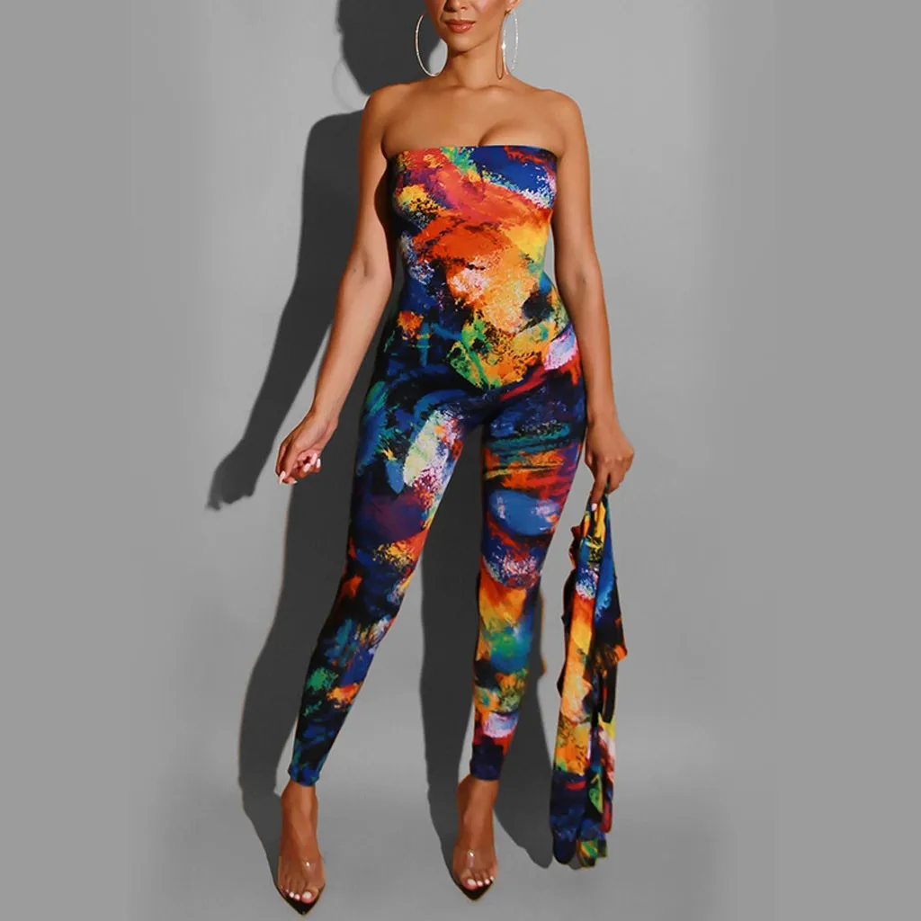 Обтягивающий женский комбинезон с принтом, многоцветный Повседневный сексуальный тонкий комбинезон без рукавов с открытыми плечами, комплект уличной одежды mono de mujer 2020 E