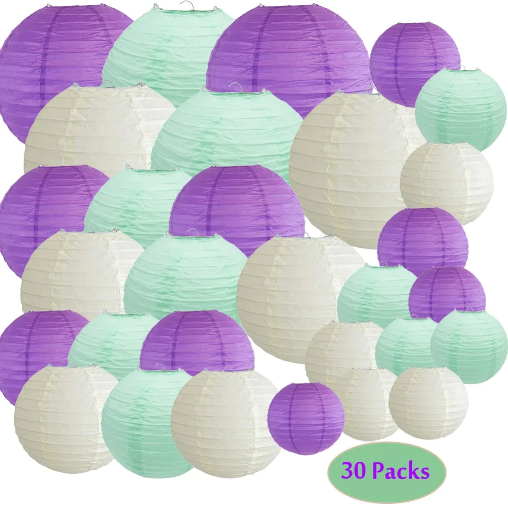 ASSORTED SIZES - Each pack includes 30 pcs paper lanterns with 6 round pieces in each popular size of 6", 8", 10", 12" and 14". and Have 3 colors that including mint green, beige and purple.