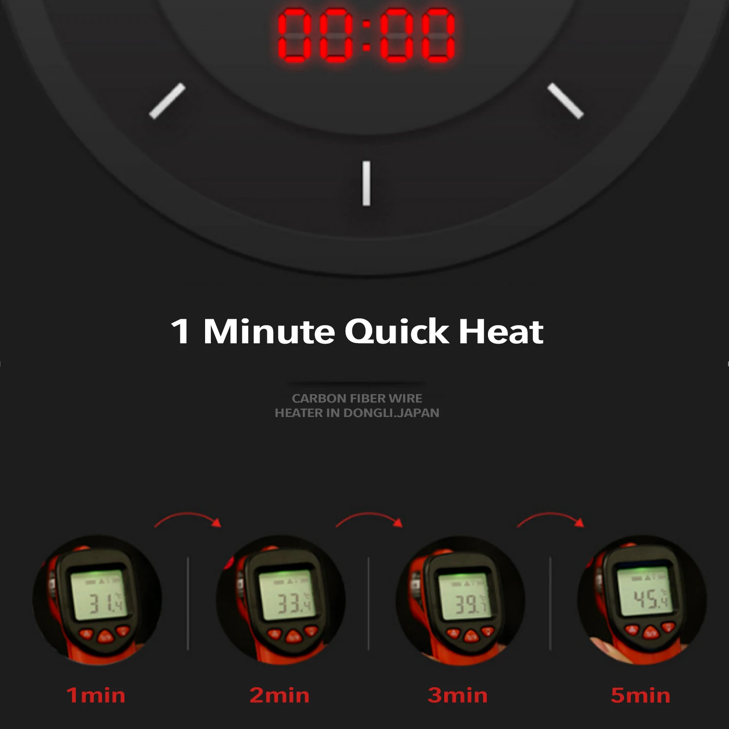 Upgraded heating elements generating heat across the front and back to make you feel warm in 360 degrees. One button for 3 heating settings, made of soft skin-friendly material which ensures smooth and comfortable feeling. Design with the latest carbon fiber for heats up quickly within 1-3 seconds.