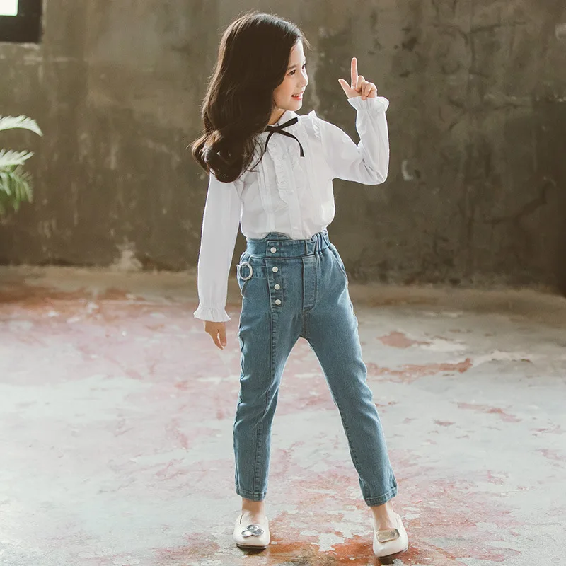 Белые рубашки с длинным рукавом для девочек, блузки с оборками на шее и бантом для девочек, детские топы из бутика для подростков 2020