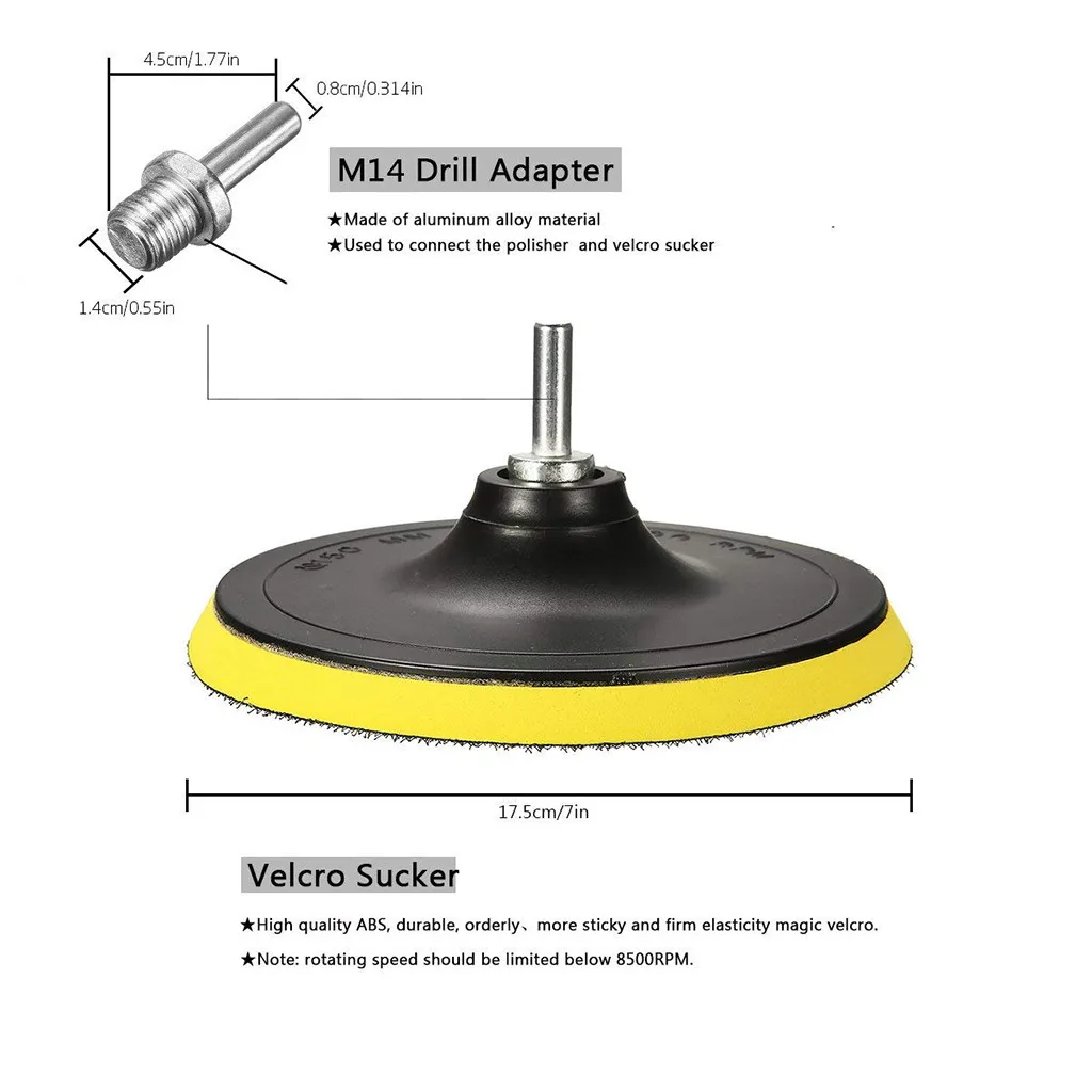 1. Полировальные прокладки с дрелью Адаптер, клейкая подложка, задняя часть диска имеет застежку-липучку, так что вы можете Легко Замените губку или шерстяную полировальную прокладку.