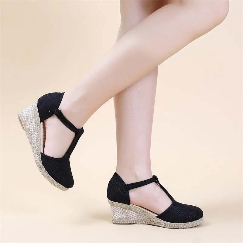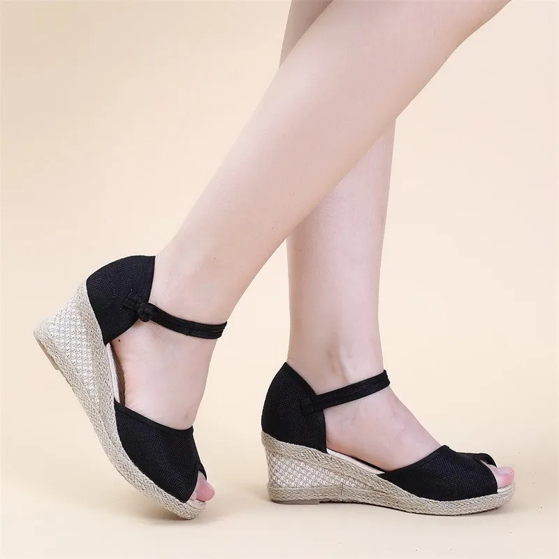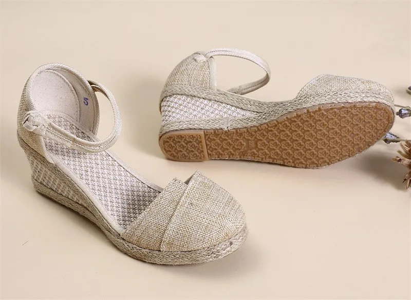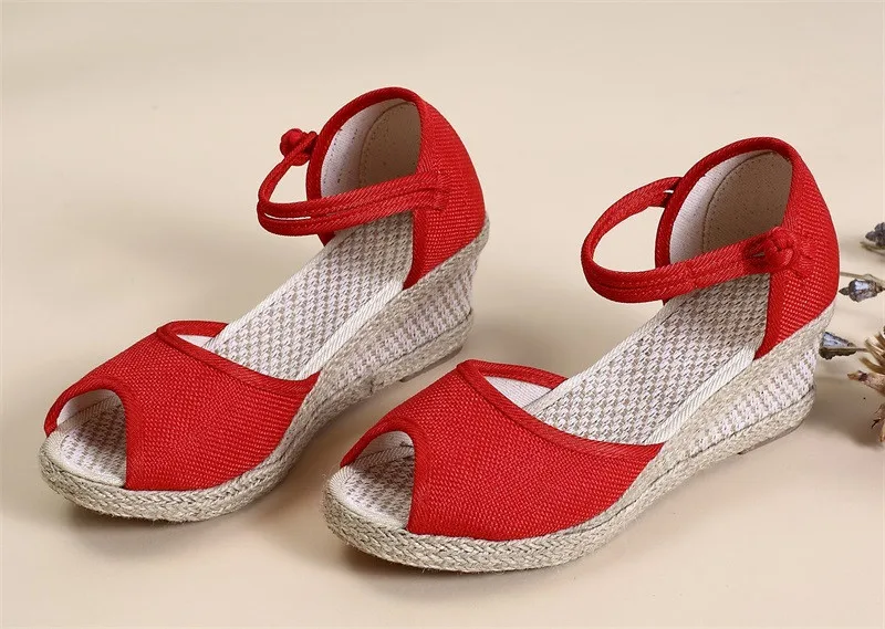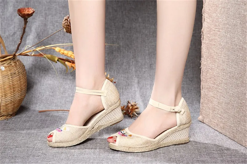 Летние туфли-лодочки на высоком каблуке и платформе с вышивкой; Женские босоножки; Винтажные повседневные тканевые Эспадрильи на танкетке