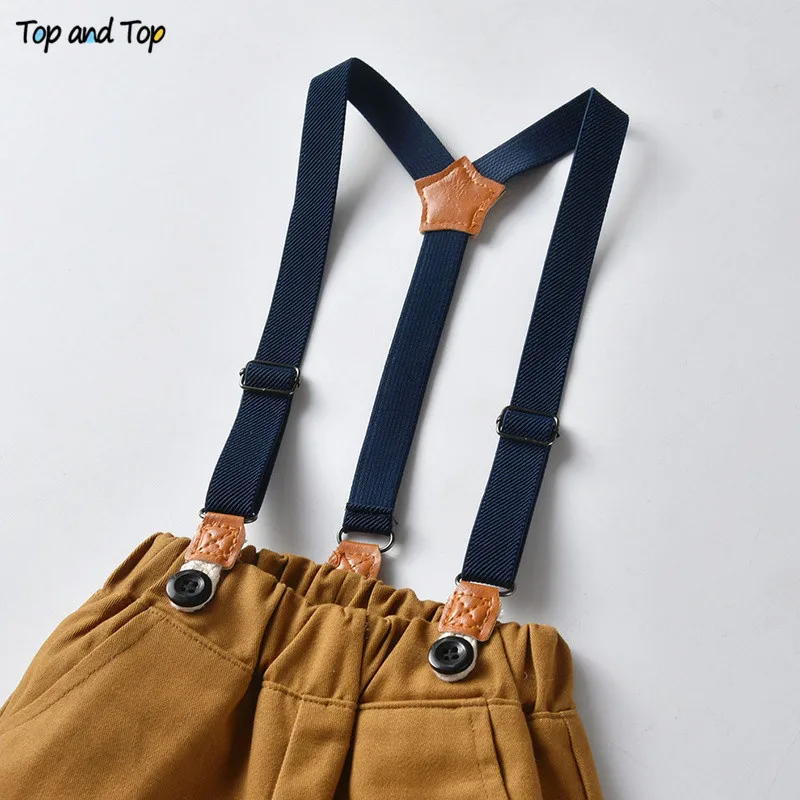 Топ и топ, летний комплект одежды джентльмена для маленьких мальчиков, рубашка в полоску с короткими рукавами и бантом + шорты на подтяжках одежда для маленьких мальчиков, Bebes