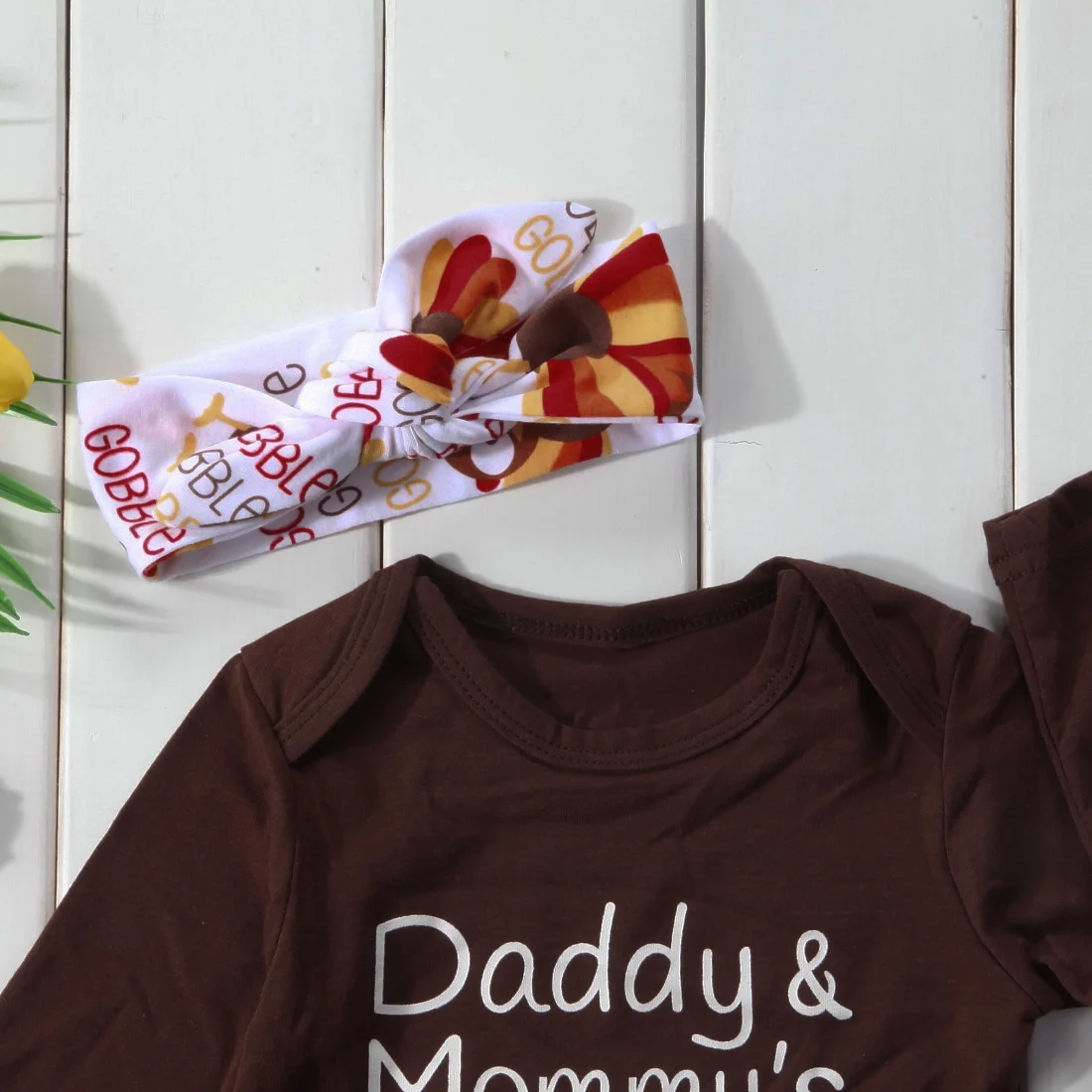 Baby Girls Romper Tops+Pants 4PCS Thanksgiving Set !! High quality and Brand new 100% Main Color: As Picture Show New in Fashion Material: Cotton Blend Attention plz: If your kid is chubby, we recomend choosing a larger size, thanks. Please kindly refer to your kids actual height and the size chart before buying/bidding. Thanks.Package included: 1x Tops 1x Pants 1x Hat 1x Headband Size Chart: