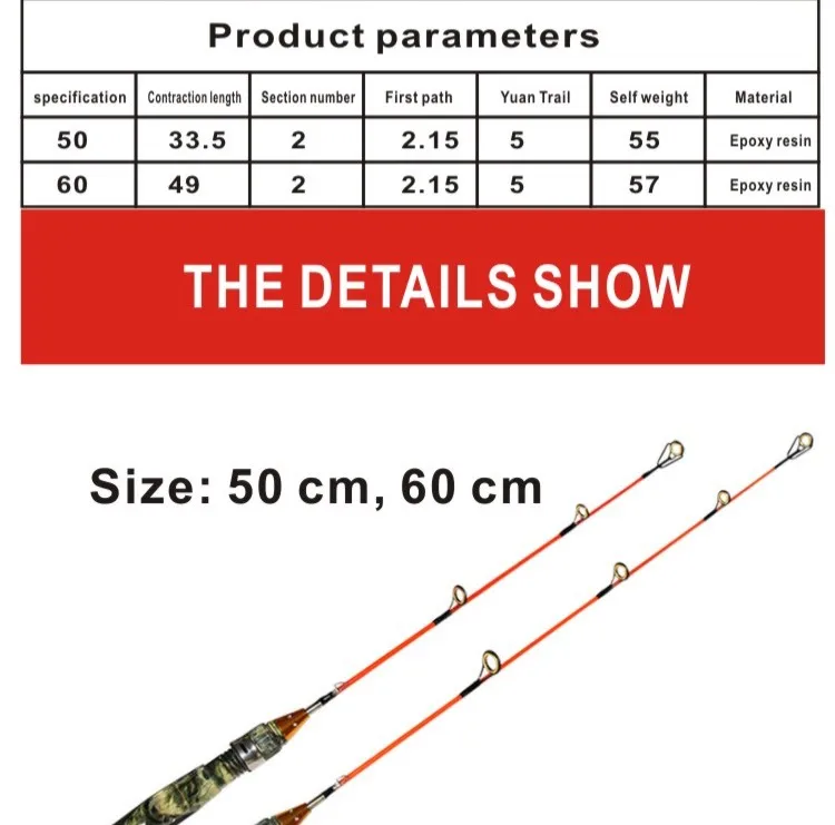 Бренд: Лида рыбы Размеры: 50 см, 60 см Верхний диаметр: 2,15 мм Диаметр дна: 5 мм Тип: удочка для ледовой рыбалки Цвет: камуфляжные футболки в мозаичном стиле Материал изделия: FRP эпоксидная смола