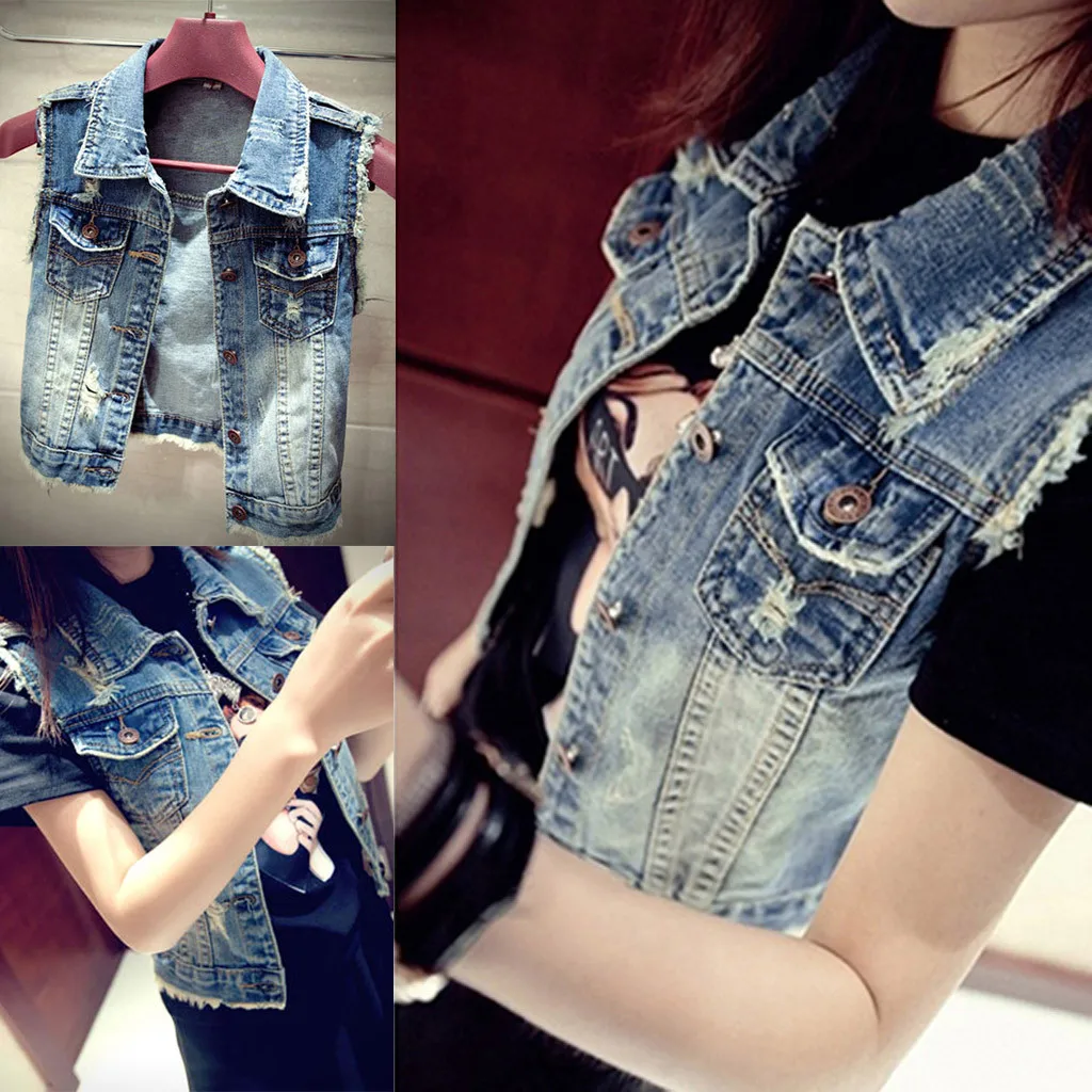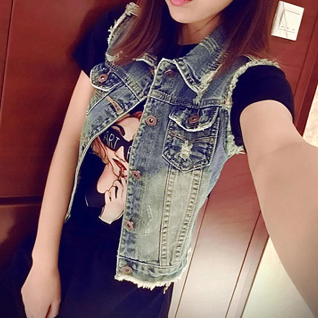 Модный женский короткий джинсовый жилет без рукавов с воротником под горло и пуговицами; Верхняя одежда в ковбойском стиле