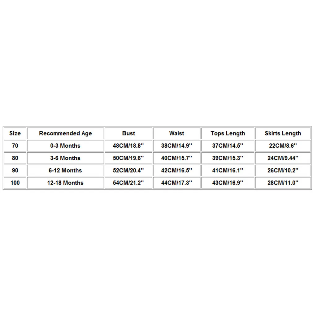 | Size | Recommended Age | Bust | Waist | Tops Length | Skirts Length |