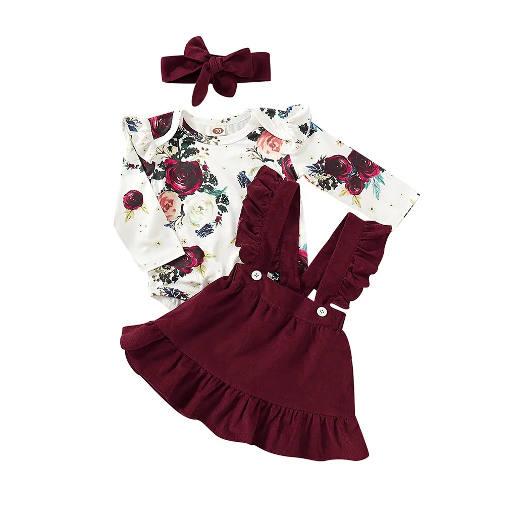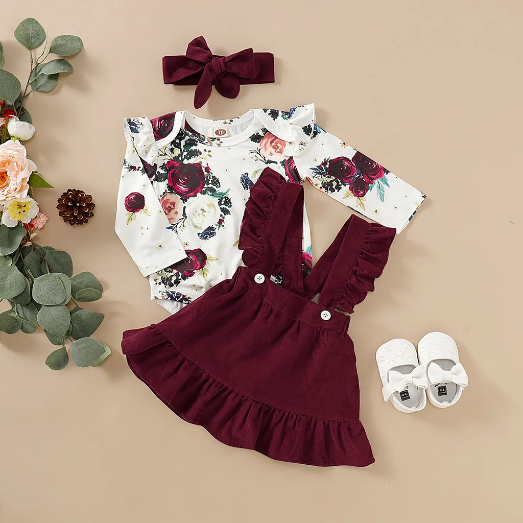 Little Girl There Piece Suit Dress Long Sleeve Bodysuit And Suspender Dress Cute Fashion Girl's Clothes With Flowers Hair Band