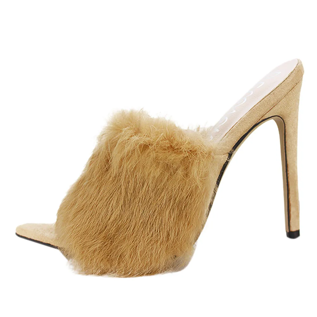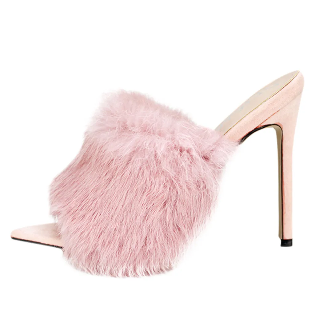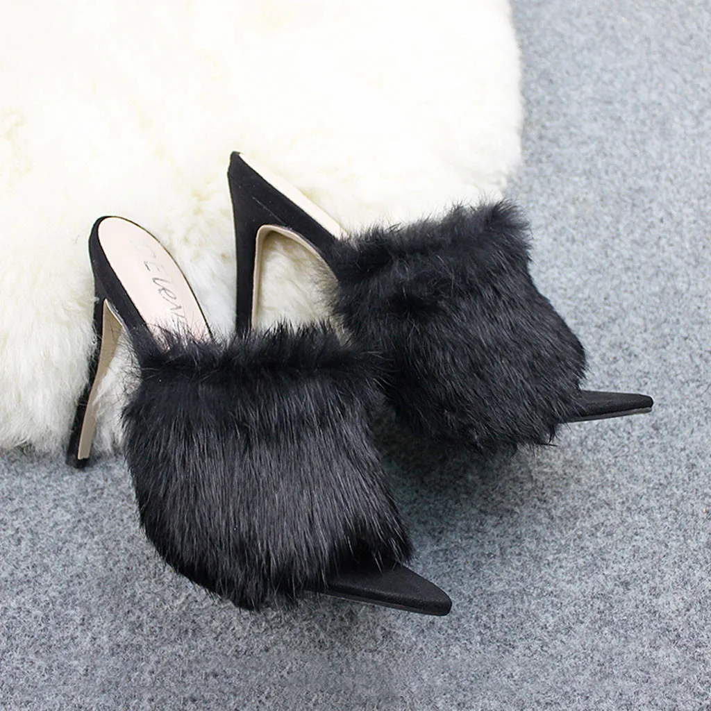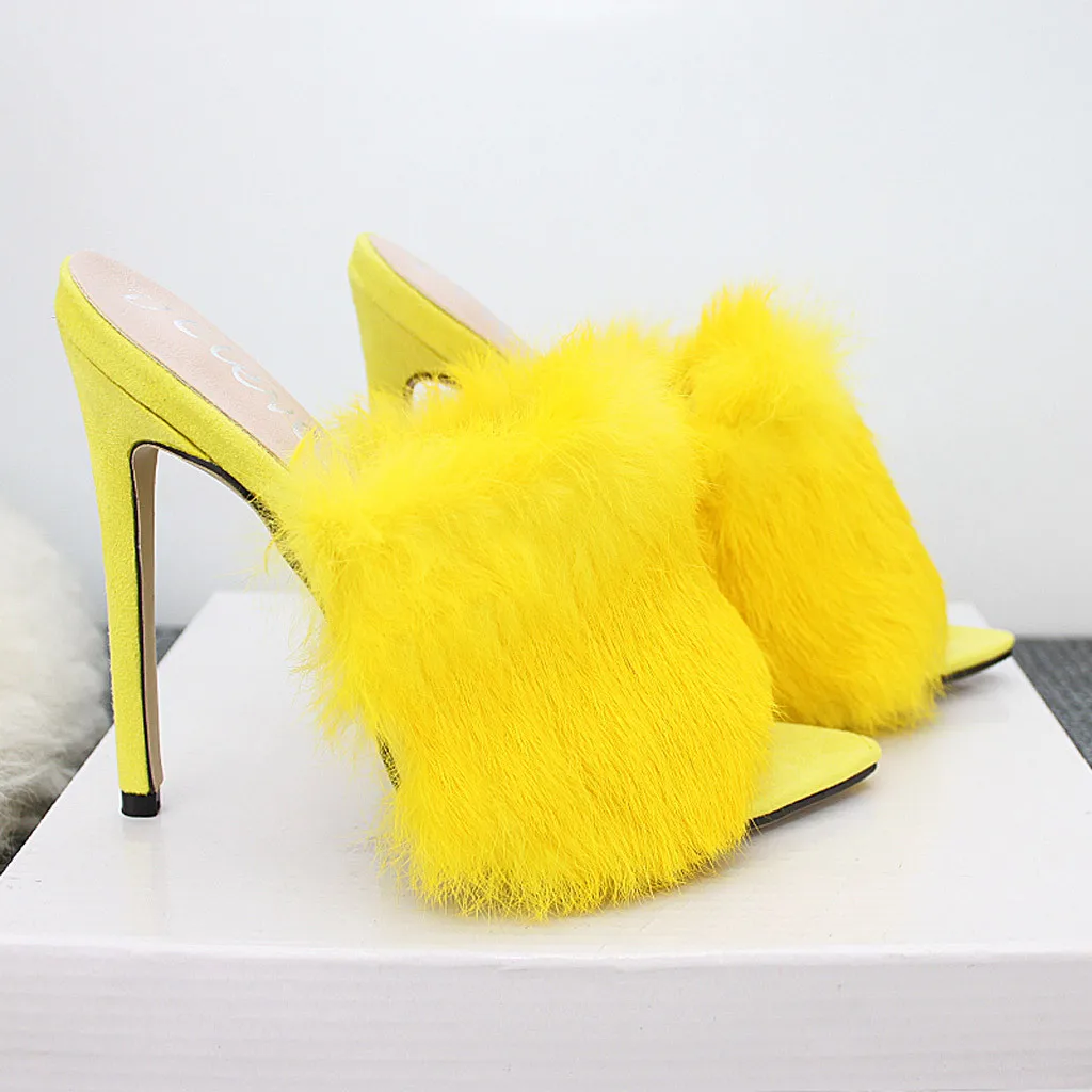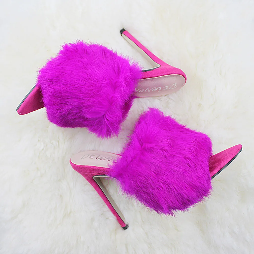 Пикантные туфли на высоком каблуке с кроличьим мехом ярких цветов; сезон весна-осень; босоножки; женская обувь