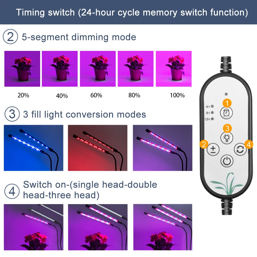 Функция: циклический временной Функция (4 H, 8 часов, 12 H) 24-часовой времени цикла, пятью уровнями яркости, три наполнителя светильник режимы: Красный светильник, красный + синий светильник, синий светильник