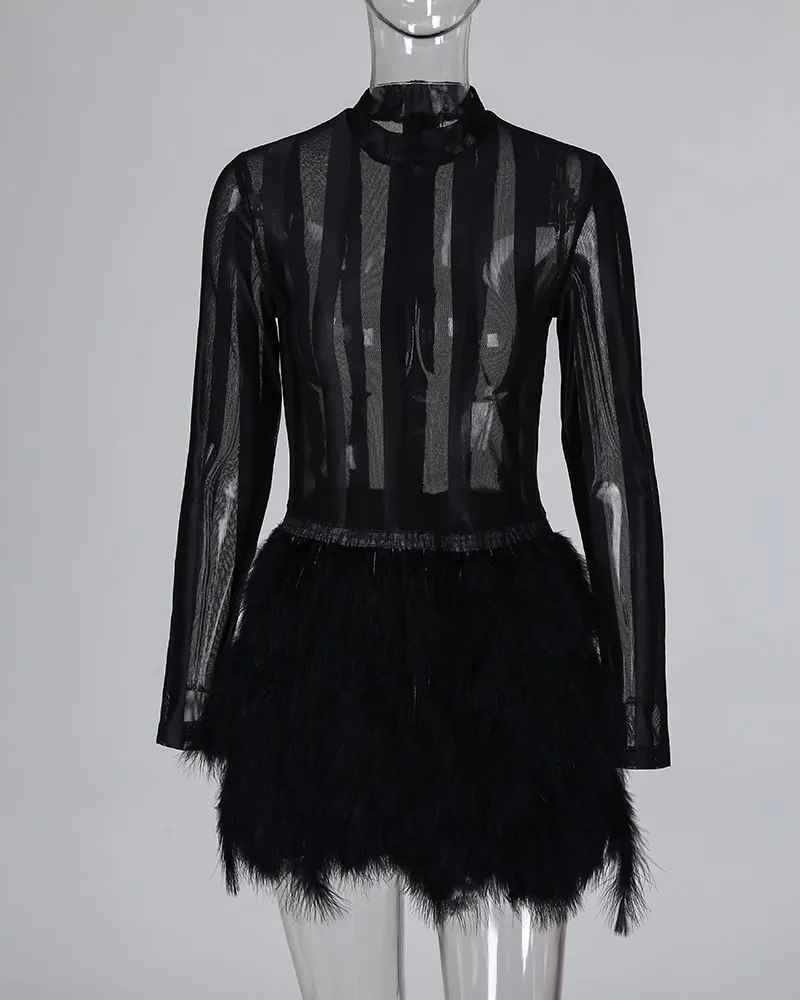 Style:Sheer Mesh Long Sleeve Faux Fur Dress Clubwear