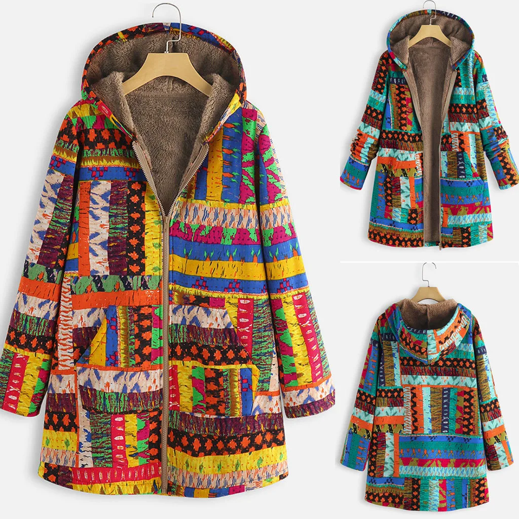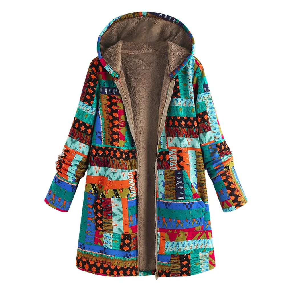 Женская зимняя теплая верхняя одежда с цветным принтом, с капюшоном и карманами, большие размеры, пальто с застежкой