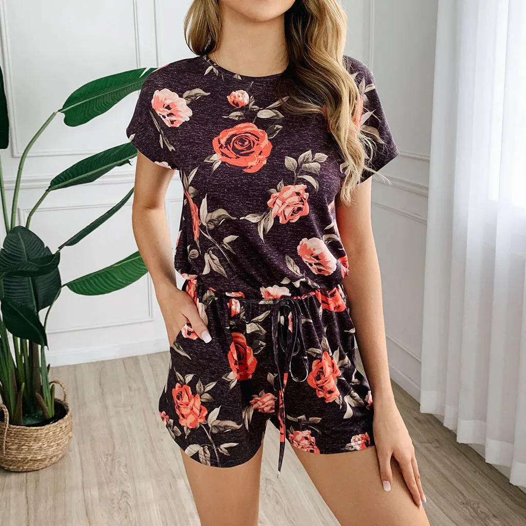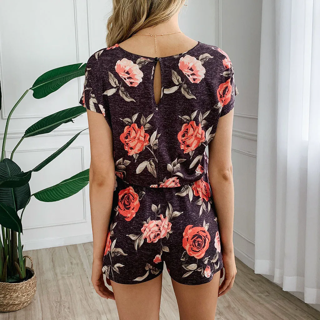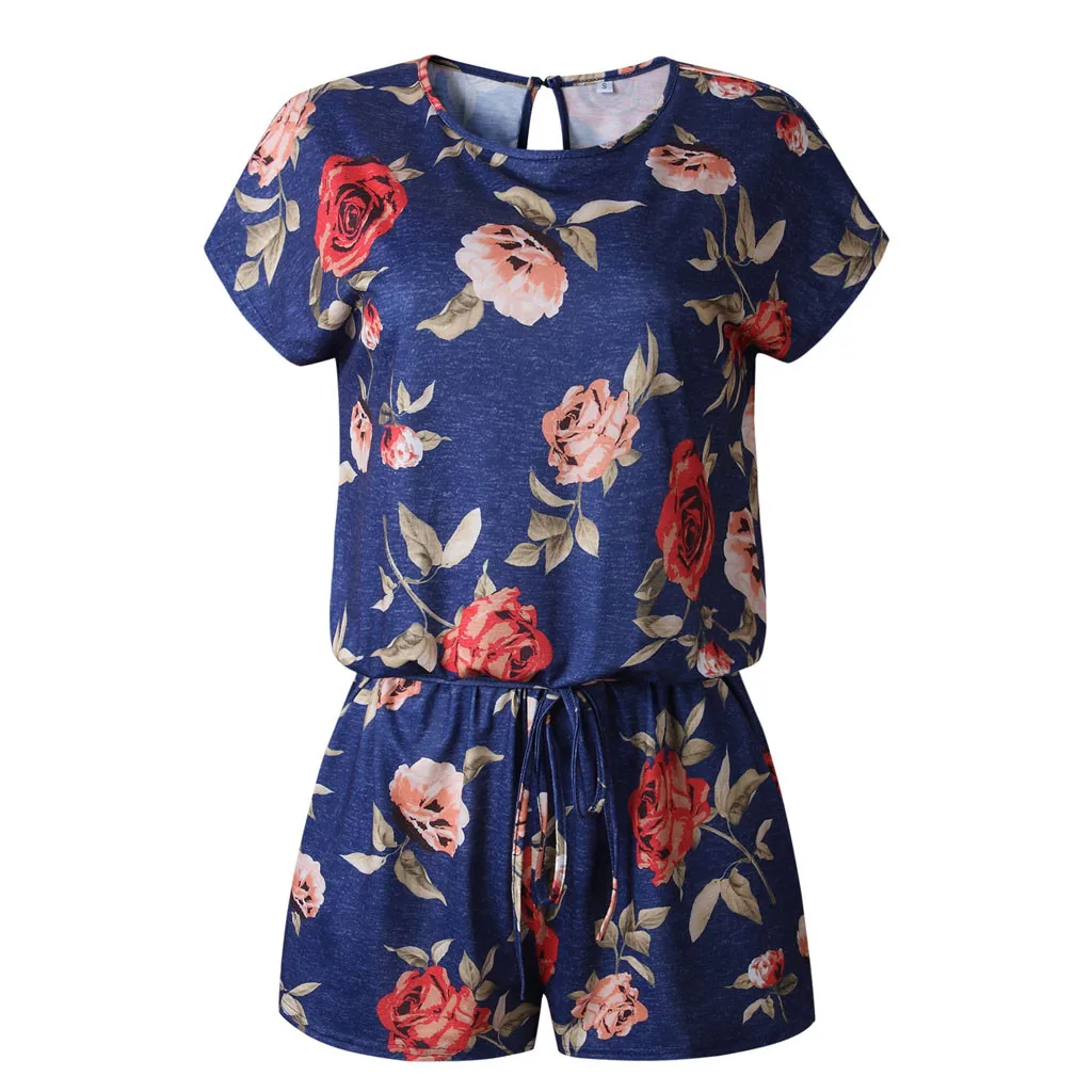 Женский Летний комбинезон, Модный повседневный комбинезон с цветочным принтом, круглым вырезом и коротким рукавом, 2020