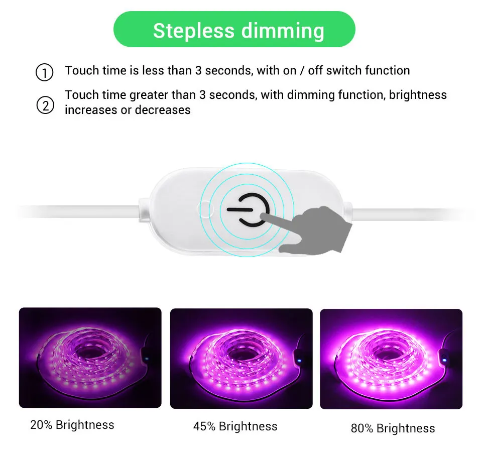 Ручной переключатель развертки: Задняя фара оснащена ручной микроволновый датчик переключатель. Просто проведите по выключателю, чтобы включить светильник, а затем снова выключите его и постоянно перемещайте в мигающий режим. Сенсорный переключатель: * Регулировка яркости, вы можете регулировать яркость от темного до темного по мере необходимости. * С функцией памяти последний режим освещения будет записан при использовании, и тот же режим освещения будет использоваться при повторном использовании. * Входное напряжение 5 В постоянного тока, безопасно для использования. * Хороший эффект отвода тепла, энергосбережение и длительный срок службы. 1: светодиодный чип: SMD 2835 2: Цвет излучения: розовый 3: Уровень защиты: водонепроницаемый/не водонепроницаемый 4: Рабочее напряжение: 5 В 5: светодиодный количество: 60 шт./метр 6: длина: 0,5 м/1 м/1,5 м/2 м/3 м Применение: Идеально подходит для небольших посадочных коробок, посадочных палаток, гидропоники, бонсай, садов и т. Д.