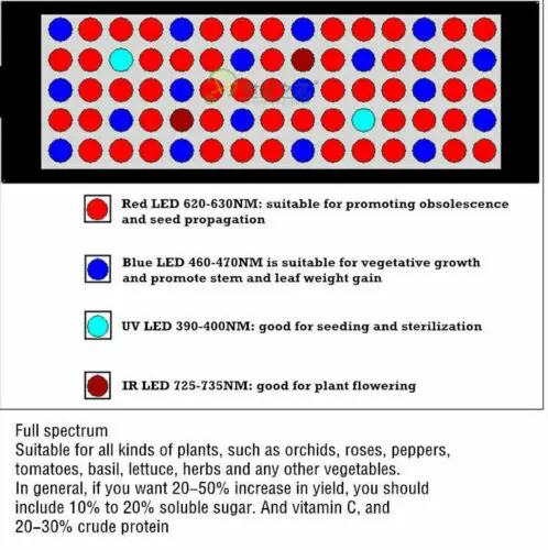 Существует так многие виды светодиодный grow lights на рынке, но большинство из них не используйте реальный рост светодиодный s в их растут огни, и длиной волны их огни являются совершенно неправильно, это уничтожит ваши растения, это попустит ваше время и деньги) синий (430нм 460нм, поможет растениям расти); Красный (630нм 660нм, Помогает растениям в цветении); УФ (длина волны: 380нм), наши огни для выращивания помогают вашим растениям, цветам, гидро и т. Д. Расти лучше, лучший выбор для вас.