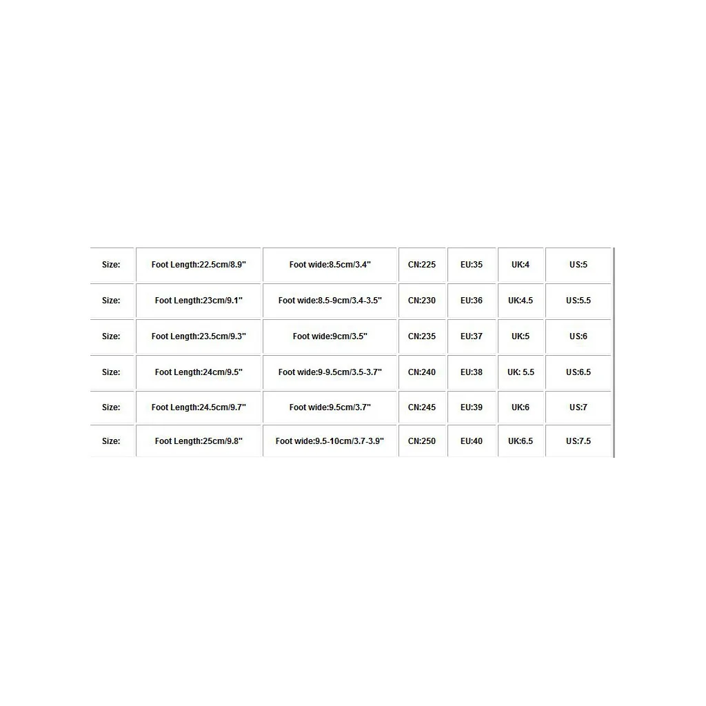 Package : 1 Pair Shoes(Not Including Shoebox)| Size | Foot Length | Foot wide | CN | EU | UK | US |