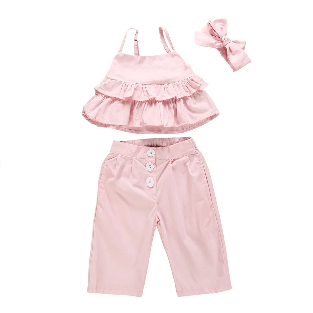 Детские ремни для маленьких девочек, топы с оборками, футболка + штаны + повязка на голову, комплект одежды