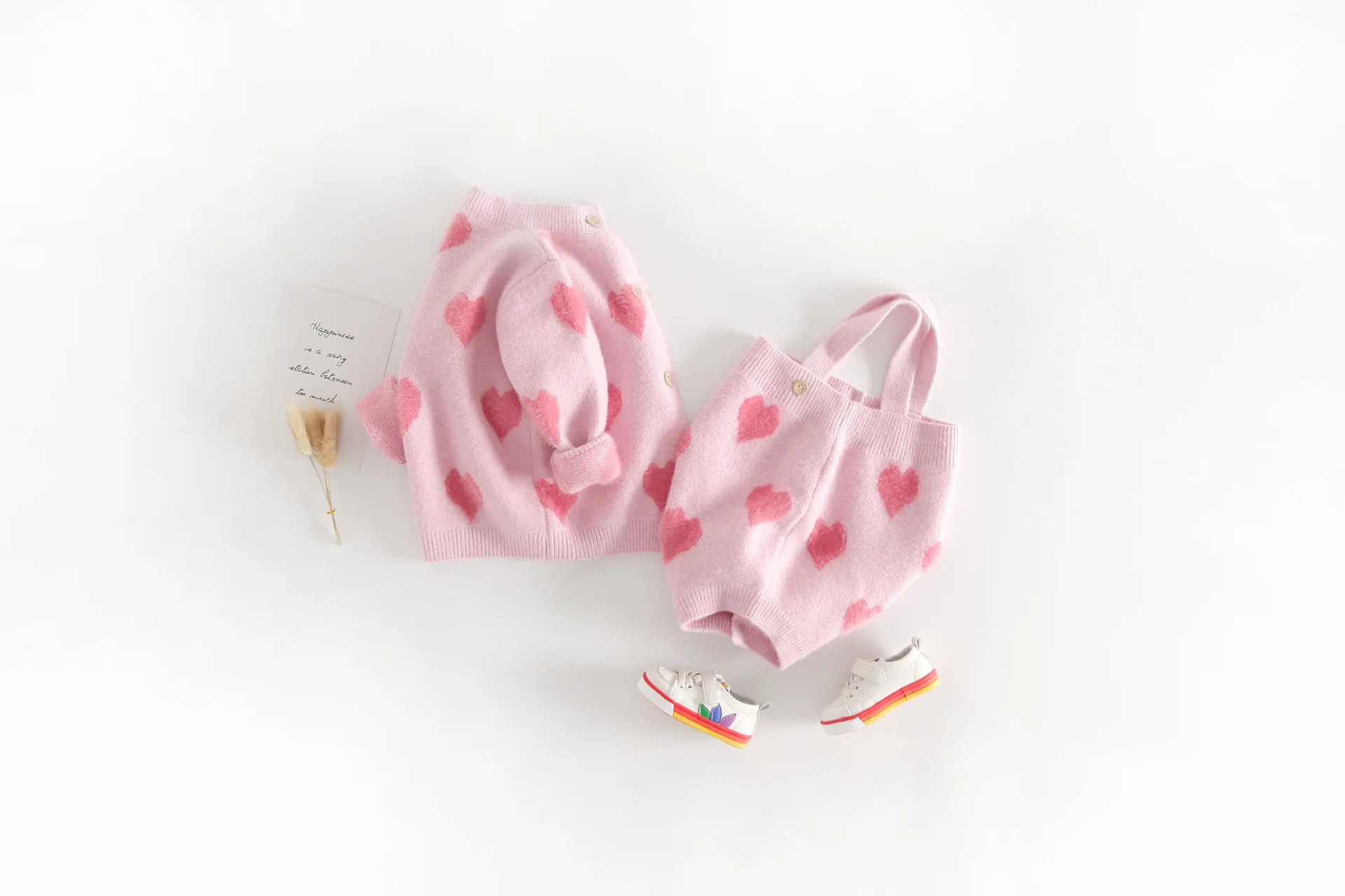 Новинка 2020 года; розовый комплект одежды для новорожденных девочек; милое пальто-свитер с розовым сердцем; цельнокроеный комбинезон на бретелях; шерстяной кардиган для девочек