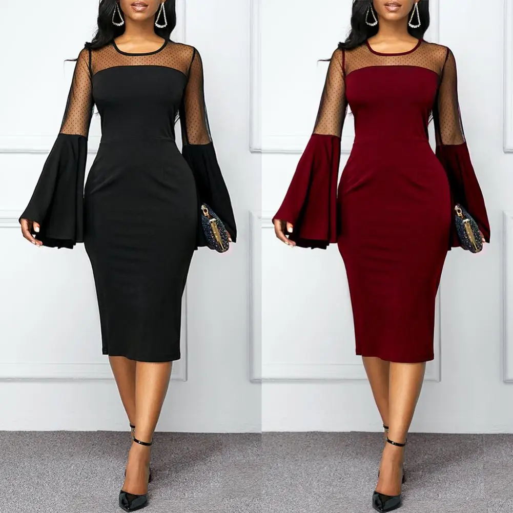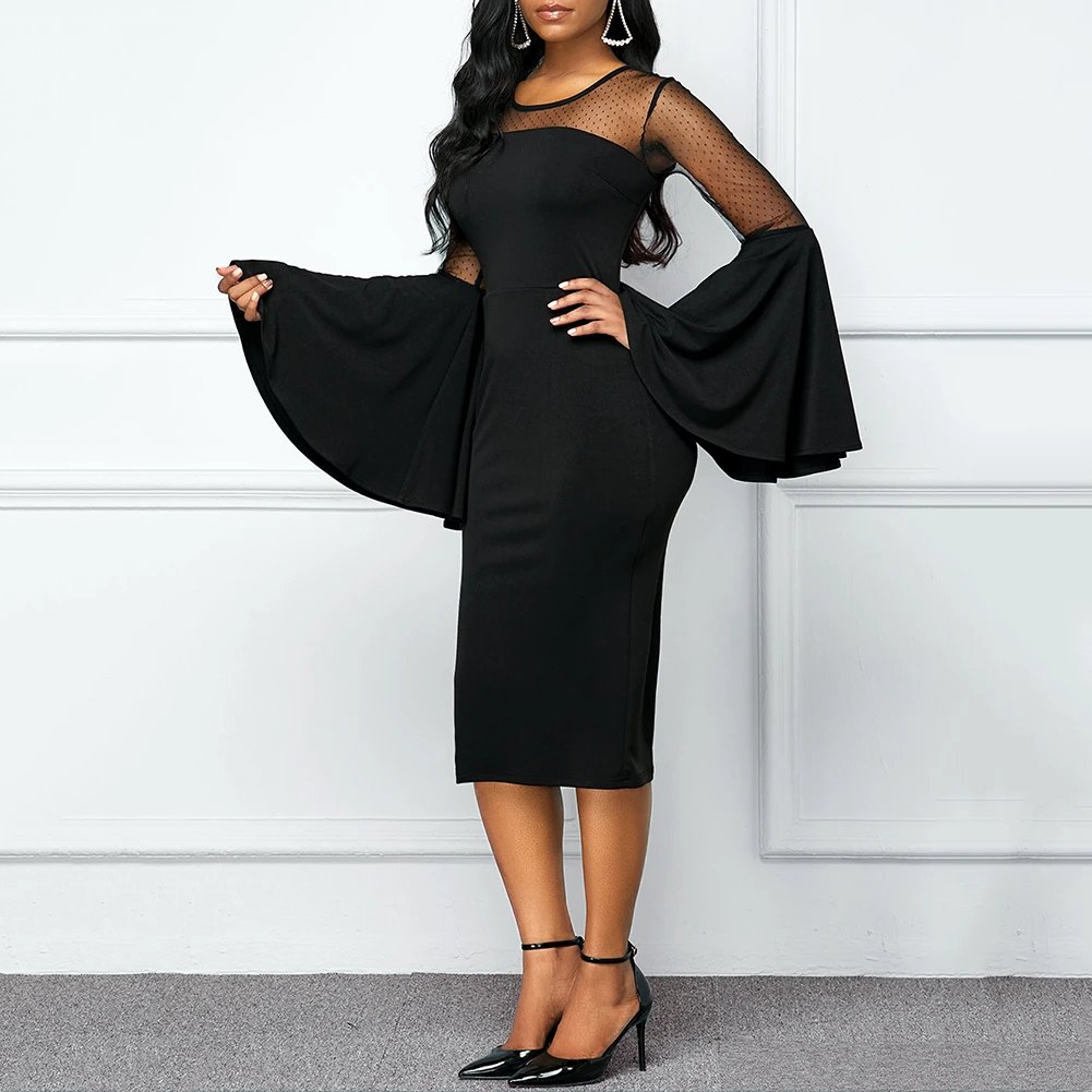 Офисное женское платье миди с круглым вырезом и расклешенными рукавами