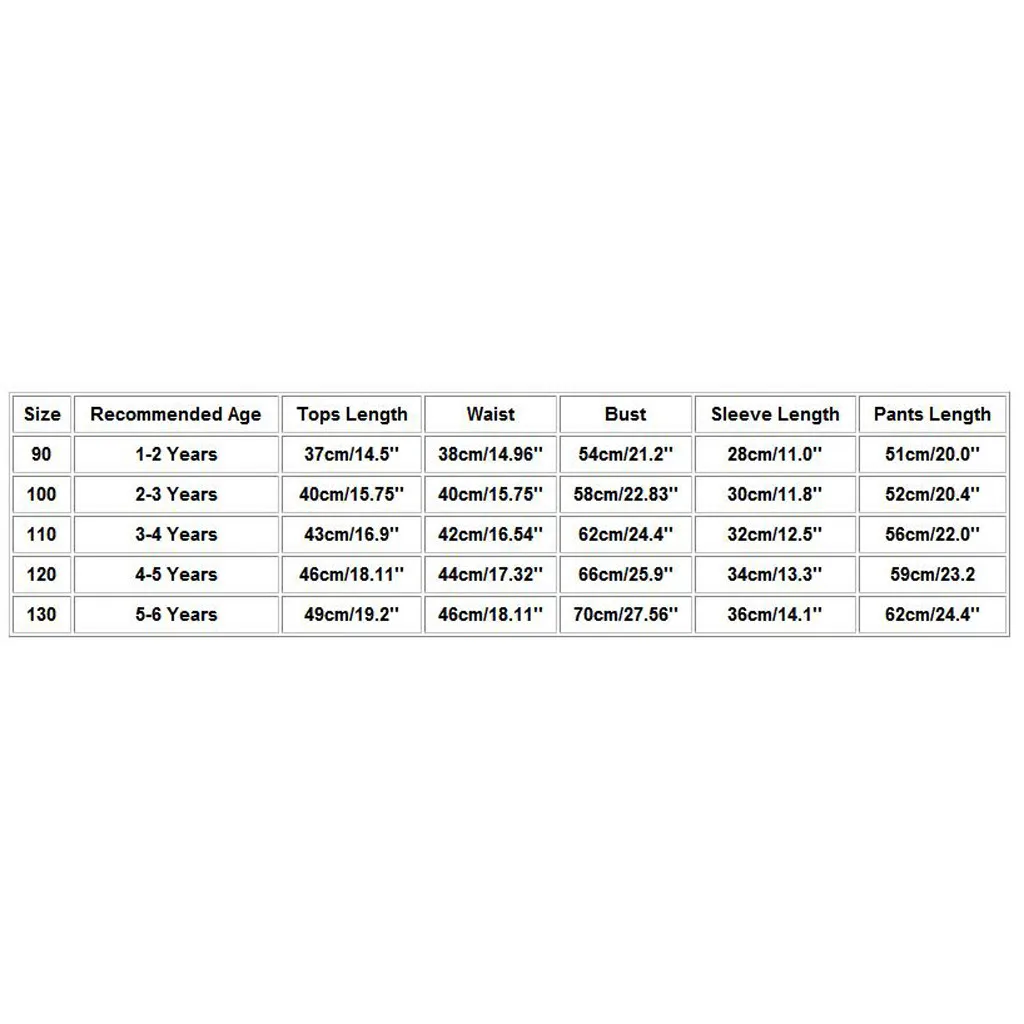 | Размеры | Рекомендуемый возраст | Топы Длина | Обхват талии | Обхват груди | Рукав Длина | Брюки Длина |