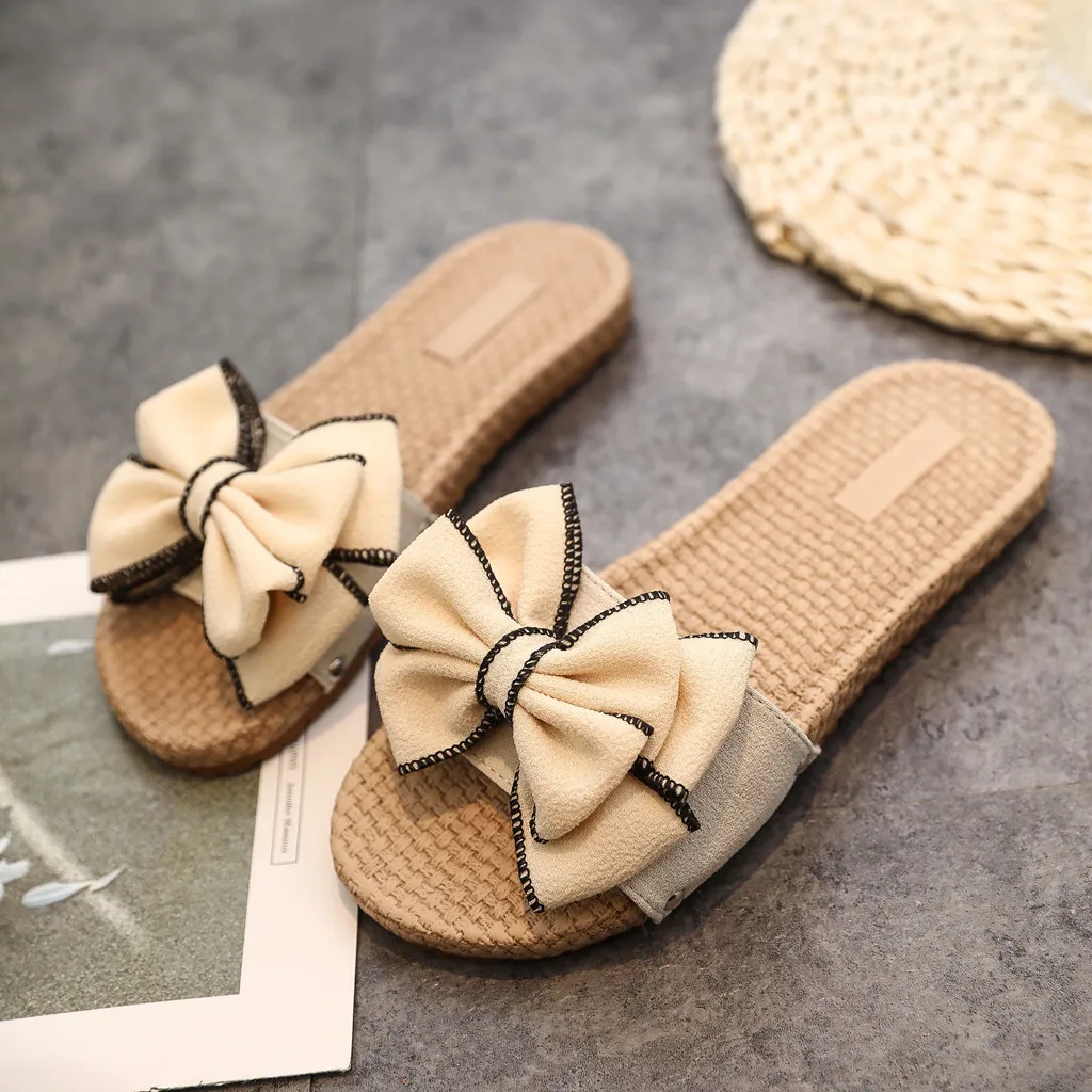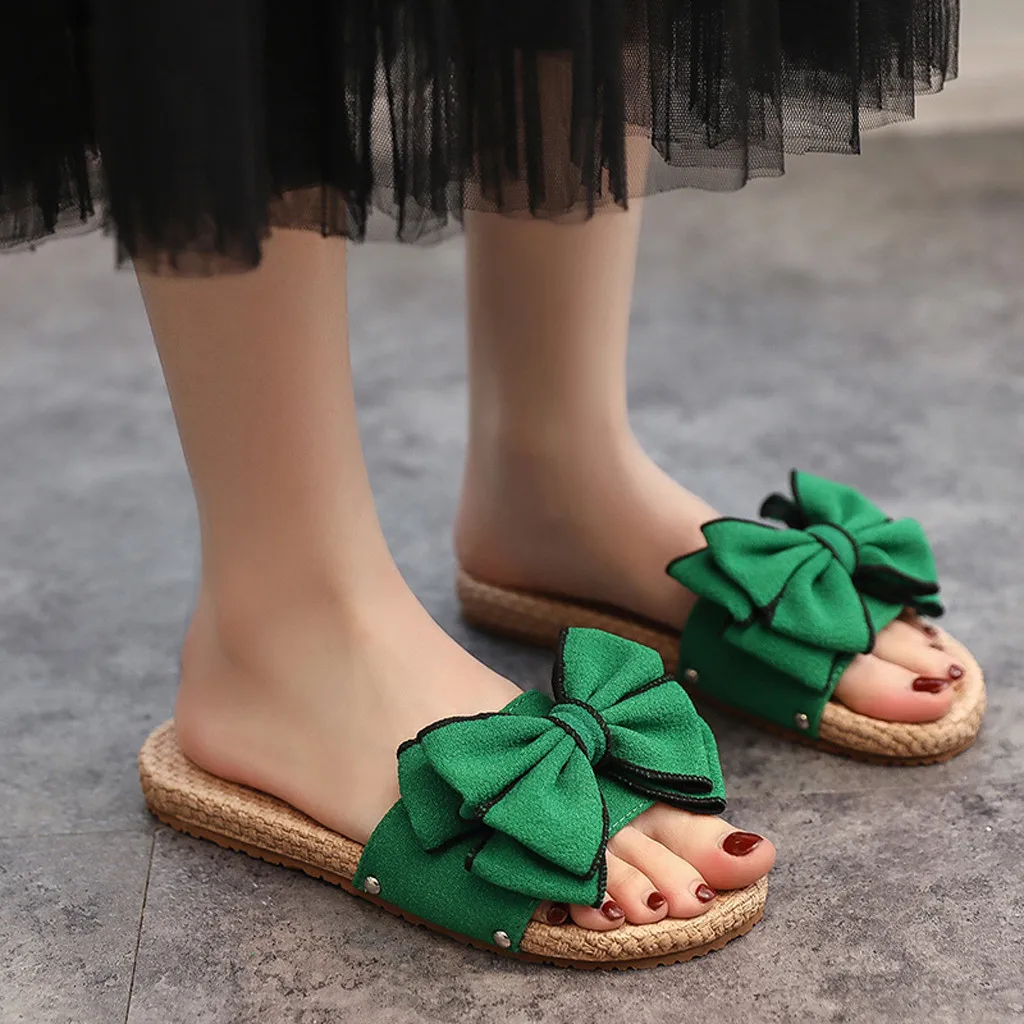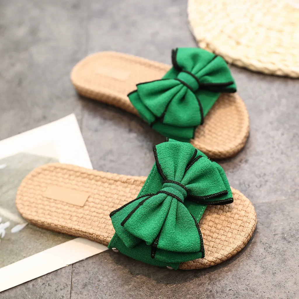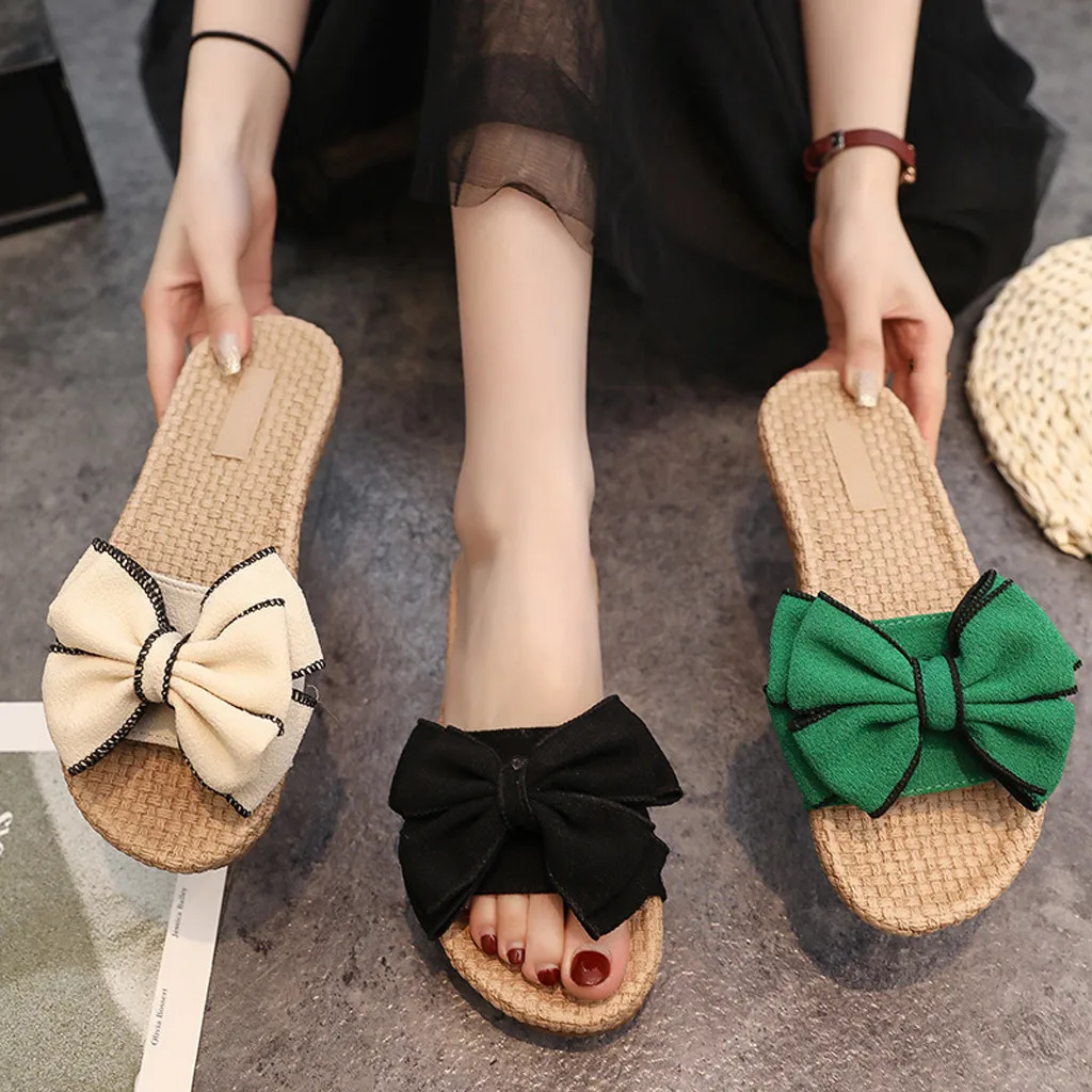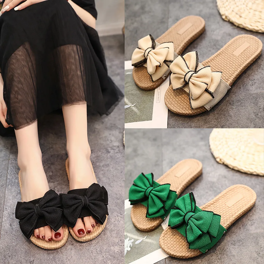 Женские повседневные тапочки на плоской подошве с круглым носком и бантом; пляжные сандалии
